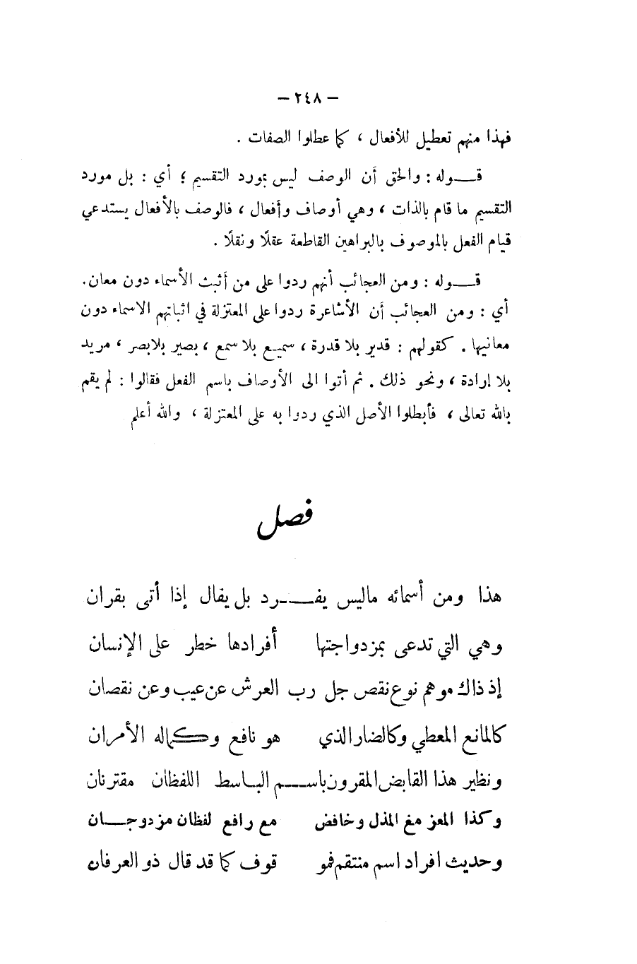 إِذْ ذَاك موهم نوع نقص جلّ رب الْعَرْش عَن عيب وَعَن نُقْصَان ... كالمانع الْمُعْطِي وكالضار الَّذِي ... هُوَ نَافِع وكماله الْأَمْرَانِ