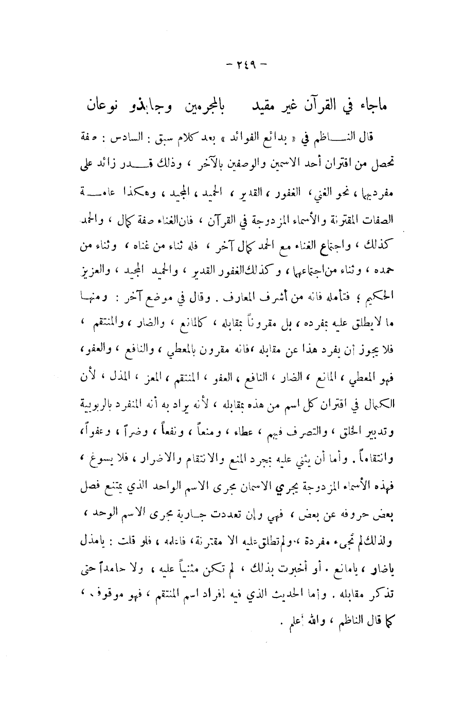 قَالَ النَّاظِم فِي بَدَائِع الْفَوَائِد بعد كَلَام سبق السَّادِس صفة تحصل من اقتران أحد الاسمين والوصفين بِالْآخرِ وَذَلِكَ قدر زَائِد على مفرديهما نَحْو الْغَنِيّ الغفور الْقَدِير الحميد الْمجِيد وَهَكَذَا عَامَّة الصِّفَات المقترنة والاسماء المزدوجة فِي الْقُرْآن فان الْغناء صفة كَمَال وَالْحَمْد كَذَلِك واجتماع الْغناء مَعَ الْحَمد كَمَال آخر فَلهُ ثَنَاء من غناهُ وثناء من حَمده وثناء من اجْتِمَاعهمَا وَكَذَلِكَ الغفور الْقَدِير والحميد الْمجِيد والعزيز الْحَكِيم فَتَأَمّله فانه من أشرف المعارف وَقَالَ فِي مَوضِع أخر وَمِنْهَا مَا لَا يُطلق عَلَيْهِ بمفرده بل مَقْرُونا بمقابله كالمانع والضار والمنتقم فَلَا يجوز أَن يفرد هَذَا عَن مُقَابِله فانه مقرون بالمعطي والنافع وَالْعَفو فَهُوَ الْمُعْطِي الْمَانِع الضار النافع الْعَفو المنتقم الْمعز المذل لِأَن الْكَمَال فِي اقتران كل اسْم من هَذِه بِمُقَابلَة لِأَنَّهُ يُرَاد بِهِ أَنه الْمُنْفَرد بالربوبية وتدبير الْخلق وَالتَّصَرُّف فيهم عَطاء ومنعا ونفعا وضرا وعفوا وانتقاما واما ان يثني عَلَيْهِ بِمُجَرَّد الْمَنْع والإنتقام والإضرار فَلَا يسوغ فَهَذِهِ الْأَسْمَاء المزدوجة يجْرِي الاسمان مجْرى الِاسْم الْوَاحِد الَّذِي يمْتَنع فصل بعض حُرُوفه عَن بعض فَهِيَ وَإِن تعدّدت جَارِيَة مجْرى الِاسْم الوحد وَلذَلِك لم تَجِيء مُفْردَة وَلم تطلق عَلَيْهِ الا مقترنة فاعلمه فَلَو قلت يَا مذل يَا ضار يَا مَانع أَو اخبرت بذلك لم تكن مثنيا عَلَيْهِ وَلَا حامدا حى تذكر مُقَابِله وَأما الحَدِيث الَّذِي فِيهِ إِفْرَاد اسْم المنتقم فَهُوَ مَوْقُوف كَمَا قَالَ النَّاظِم وَالله أعلم