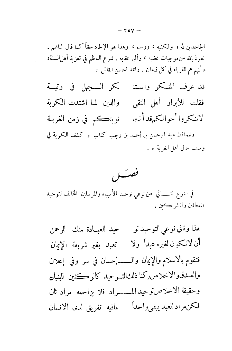 الجاحدين لله ولكتبه وَرُسُله وَهَذَا هُوَ الْإِلْحَاد حَقًا كَمَا قَالَ النَّاظِم نَعُوذ بِاللَّه من مُوجبَات غَضَبه وأليم عِقَابه شرع النَّاظِم فِي تَعْزِيَة أهل السّنة وَأَنَّهُمْ هم الغرباء فِي كل زمَان وَلَقَد أحسن الْقَائِل ... قد عرف الْمُنكر واستن ... كرّ الْجَهْل فِي رُتْبَة ... فَقلت للأبرار أهل التقى ... وَالدّين لما اشتدت الْكُرْبَة ... لَا تنكروا أحوالكم قد أَتَت ... نوبتكم فِي زمن الغربة ...