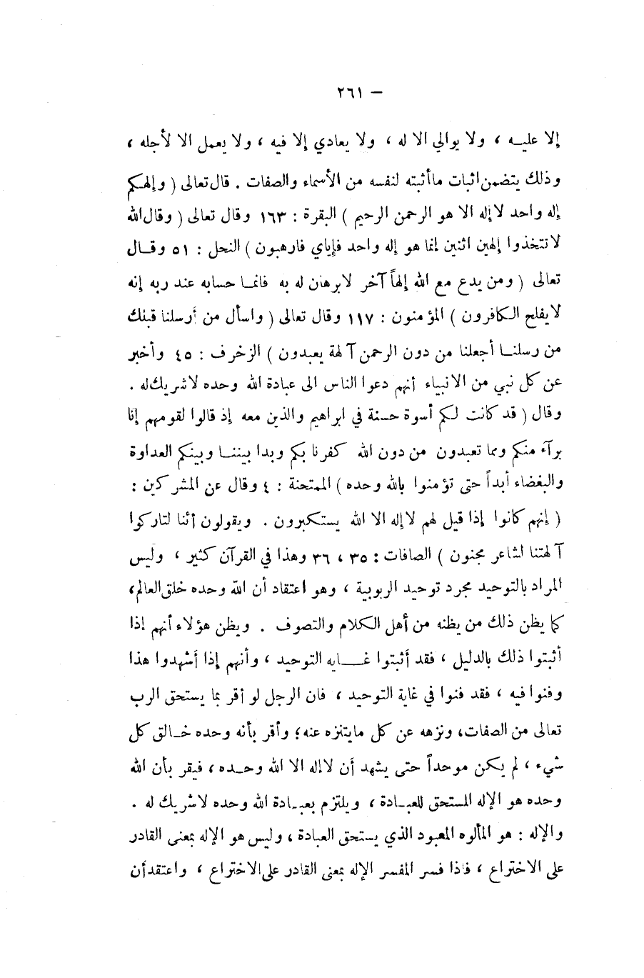 إِلَّا عَلَيْهِ وَلَا يوالي الا لَهُ وَلَا يعادي إِلَّا فِيهِ وَلَا يعْمل الا لأَجله وَذَلِكَ يتَضَمَّن أثبات مَا أثْبته لنَفسِهِ من الاسماء وَالصِّفَات قَالَ تَعَالَى {وإلهكم إِلَه وَاحِد لَا إِلَه إِلَّا هُوَ الرَّحْمَن الرَّحِيم} الْبَقَرَة وَقَالَ تَعَالَى وَقَالَ الله {لَا تَتَّخِذُوا إِلَهَيْنِ اثْنَيْنِ إِنَّمَا هُوَ إِلَه وَاحِد فإياي فارهبون} النَّحْل وَقَالَ تَعَالَى {وَمن يدع مَعَ الله إِلَهًا آخر لَا برهَان لَهُ بِهِ فَإِنَّمَا حسابه عِنْد ربه إِنَّه لَا يفلح الْكَافِرُونَ} الْمُؤْمِنُونَ وَقَالَ تَعَالَى {واسأل من أرسلنَا من قبلك من رسلنَا أجعلنا من دون الرَّحْمَن آلِهَة يعْبدُونَ} الزخرف وَأخْبر عَن كل نَبِي من الْأَنْبِيَاء أَنهم دعوا النَّاس الى عبَادَة الله وَحده لَا شريك لَهُ وَقَالَ {قد كَانَت لكم أُسْوَة حَسَنَة فِي إِبْرَاهِيم وَالَّذين مَعَه إِذْ قَالُوا لقومهم إِنَّا بُرَآء مِنْكُم وَمِمَّا تَعْبدُونَ من دون الله كفرنا بكم وبدا بَيْننَا وَبَيْنكُم الْعَدَاوَة والبغضاء أبدا حَتَّى تؤمنوا بِاللَّه وَحده} الممتحنة وَقَالَ عَن الْمُشْركين {إِنَّهُم كَانُوا إِذا قيل لَهُم لَا إِلَه إِلَّا الله يَسْتَكْبِرُونَ وَيَقُولُونَ أئنا لتاركوا آلِهَتنَا لشاعر مَجْنُون} الصافات وَهَذَا فِي الْقُرْآن كثير وَلَيْسَ المُرَاد بِالتَّوْحِيدِ مُجَرّد تَوْحِيد الربوبية وَهُوَ اعْتِقَاد أَن الله وَحده خلق الْعَالم كَمَا يظنّ ذَلِك من يَظُنّهُ من اهل الْكَلَام والتصوف ويظن هَؤُلَاءِ أَنهم اذا أثبتوا ذَلِك بِالدَّلِيلِ فقد أثبتوا غَايَة التَّوْحِيد وَأَنَّهُمْ اذا أشهدوا هَذَا وفنوا فِيهِ فقد فنوا فِي غَايَة التَّوْحِيد فان الرجل لَو أقرّ بِمَا يسْتَحق الرب تَعَالَى من الصِّفَات ونزهه عَن كل مَا يتنزه عَنهُ وَأقر بِأَنَّهُ وَحده خَالق كل شئ لم يكن موحدا حَتَّى يشْهد أَن لَا إِلَه إِلَّا الله وَحده فَيقر بِأَن الله وَحده هُوَ الْإِلَه الْمُسْتَحق لِلْعِبَادَةِ ويلتزم بِعبَادة الله وَحده لَا شريك لَهُ والإله هُوَ المألوه المعبود الَّذِي يسْتَحق الْعِبَادَة وَلَيْسَ هُوَ الْإِلَه بِمَعْنى الْقَادِر على الاختراع فاذا فسر الْمُفَسّر الْإِلَه بِمَعْنى الْقَادِر على الاختراع واعتقد أَن