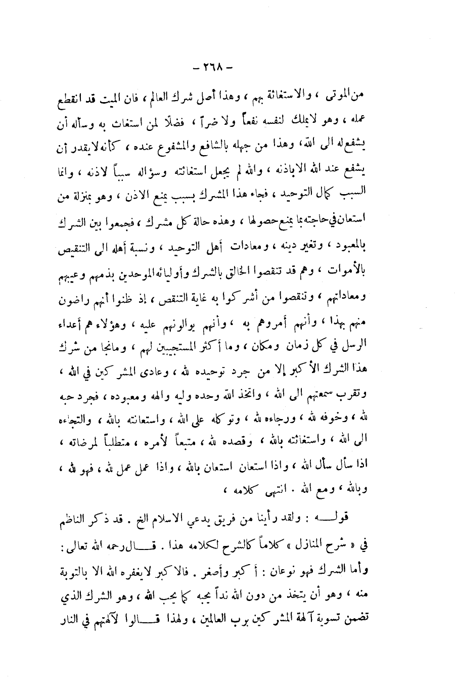 قَوْله وَلَقَد راينا من فريق يَدعِي الاسلام الخ قد ذكر النَّاظِم فِي شرح الْمنَازل كلَاما كالشرح لكَلَامه هَذَا قَالَ رَحمَه الله تَعَالَى وَأما الشّرك فَهُوَ نَوْعَانِ أكبر وأصغر فالاكبر لَا يغفره الله الا بِالتَّوْبَةِ مِنْهُ وَهُوَ أَن يتَّخذ من دون الله ندا يُحِبهُ كَمَا يحب الله وَهُوَ الشّرك الَّذِي تضمن تَسْوِيَة آلِهَة الْمُشْركين بِرَبّ الْعَالمين وَلِهَذَا قَالُوا لآلهتهم فِي النَّار