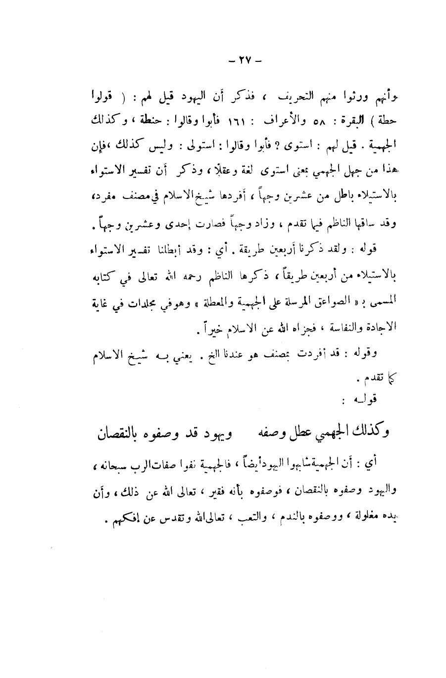 قَوْله ... وَكَذَلِكَ الجهمي عطل وَصفه ... ويهود قد وصفوه بِالنُّقْصَانِ ...