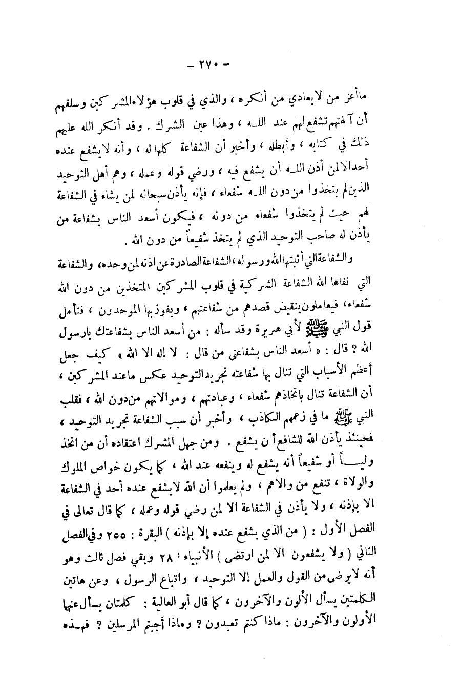 والشفاعة الَّتِي أثبتها الله وَرَسُوله الشَّفَاعَة الصادرة عَن اذنه لمن وَحده والشفاعة الَّتِي نفاها الله الشَّفَاعَة الشركية فِي قُلُوب الْمُشْركين المتخذين من دون الله شُفَعَاء فيعاملون بنقيض قصدهم من شفاعتهم ويفوز بهَا الموحدون فَتَأمل قَول النَّبِي صلى الله عَلَيْهِ وَسلم لأبي هُرَيْرَة وَقد سَأَلَهُ من أسعد النَّاس بشفاعتك يَا رَسُول الله قَالَ أسعد النَّاس بشفاعتي من قَالَ لَا إِلَه إِلَّا الله كَيفَ جعل اعظم الاسباب الَّتِي تنَال بهَا شَفَاعَته تَجْرِيد التَّوْحِيد عكس مَا عِنْد الْمُشْركين أَن الشَّفَاعَة تنَال باتخاذهم شُفَعَاء وعبادتهم وموالاتهم من دون الله فَقلب النَّبِي صلى الله عَلَيْهِ وَسلم مَا فِي زعمهم الْكَاذِب وَأخْبر ان سَبَب الشَّفَاعَة تَجْرِيد التَّوْحِيد فَحِينَئِذٍ يَأْذَن الله للشافع أَن يشفع وَمن جهل الْمُشرك اعْتِقَاده أَن من اتخذ وليا أَو شَفِيعًا أَنه يشفع لَهُ وينفعه عِنْد الله كَمَا يكون خَواص الْمُلُوك والولاة تَنْفَع من والاهم وَلم يعلمُوا ان الله لَا يشفع عِنْده اُحْدُ فِي الشَّفَاعَة الا بِإِذْنِهِ وَلَا يَأْذَن فِي الشَّفَاعَة الا لمن رَضِي قَوْله وَعَمله كَمَا قَالَ تَعَالَى فِي الْفَصْل الأول {من ذَا الَّذِي يشفع عِنْده إِلَّا بِإِذْنِهِ} الْبَقَرَة وَفِي الْفَصْل الثَّانِي {وَلَا يشفعون إِلَّا لمن ارتضى} الْأَنْبِيَاء وَبَقِي فصل ثَالِث وَهُوَ أَنه لَا يرضى من القَوْل وَالْعَمَل إِلَّا التَّوْحِيد وَاتِّبَاع الرَّسُول وَعَن هَاتين الْكَلِمَتَيْنِ يسْأَل الألون وَالْآخرُونَ كَمَا قَالَ أَبُو الْعَالِيَة كلمتان يسْأَل عَنْهُمَا الاولون وَالْآخرُونَ مَاذَا كُنْتُم تَعْبدُونَ وماذا أجبتم الْمُرْسلين فَهَذِهِ