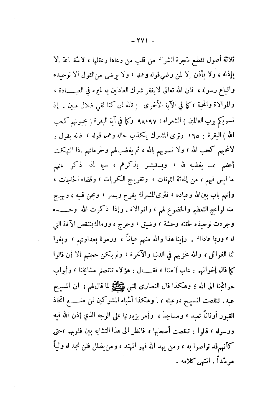 ثَلَاثَة أصُول تقطع شَجَرَة الشّرك من قلب من وعاها وعقلها لَا شَفَاعَة إِلَّا بِإِذْنِهِ وَلَا يَأْذَن إِلَّا لمن رَضِي قَوْله وَعَمله وَلَا يرضى من القَوْل الا توحيده وَاتِّبَاع رَسُوله فان الله تَعَالَى لَا يغْفر شرك العادلين بِهِ غَيره فِي الْعِبَادَة والموالاة والمحبة كَمَا فِي الْآيَة الْأُخْرَى {تالله إِن كُنَّا لفي ضلال مُبين إِذْ نسويكم بِرَبّ الْعَالمين} الشُّعَرَاء وكما فِي آيَة الْبَقَرَة {يحبونهم كحب الله} الْبَقَرَة وَترى الْمُشرك يكذب حَاله وَعَمله قَوْله فانه يَقُول لَا نحبهمْ كحب الله وَلَا نسويهم بِاللَّه ثمَّ يغْضب لَهُم ولحرماتهم إِذا انتهكت أعظم مِمَّا يغضبه لله ويستبشر بذكرهم سِيمَا إِذا ذكر عَنْهُم مَا لَيْسَ فيهم من إغاثة اللهفات وتفريج الكربات وَقَضَاء الْحَاجَات وَأَنَّهُمْ بَاب بَين الله وعباده فترى الْمُشرك يفرح وَيسر ويحن قلبه ويهبج مِنْهُ لواعج التَّعْظِيم والخضوع لَهُم والموالاة وَإِذا ذكرت الله وَحده وجردت توحيده لحقته وَحْشَة وضيق وحرج ورماك بتنقص الْآلهَة الَّتِي لَهُ وَرُبمَا عاداك رَأينَا هَذَا وَالله مِنْهُم عيَانًا ورمونا بعداوتهم وبغوا لنا الغوائل وَالله مخزيهم فِي الدُّنْيَا وَالْآخِرَة وَلم يكن حجتهم إِلَّا أَن قَالُوا كَمَا قَالَ إخْوَانهمْ عَابَ آلِهَتنَا فَقَالَ هَؤُلَاءِ تنقصتم مَشَايِخنَا وأبواب حوائجنا الى الله وَهَكَذَا قَالَ النَّصَارَى للنَّبِي صلى الله عَلَيْهِ وَسلم لما قَالَ لَهُم ان الْمَسِيح عبد تنقصت الْمَسِيح وعبته وَهَكَذَا أشباه المشوكين لمن منع اتِّخَاذ الْقُبُور أوثانا تعبد ومساجد وَأمر بزيارتها على الْوَجْه الَّذِي أذن الله فِيهِ وَرَسُوله قَالُوا تنقصت أَصْحَابهَا فَانْظُر الى هَذَا التشابه بَين قُلُوبهم حَتَّى كَأَنَّهُمْ قد تواصوا بِهِ وَمن يهد الله فَهُوَ المهتد وَمن يضلل فَلَنْ تَجِد لَهُ وليا مرشدا انْتهى كَلَامه