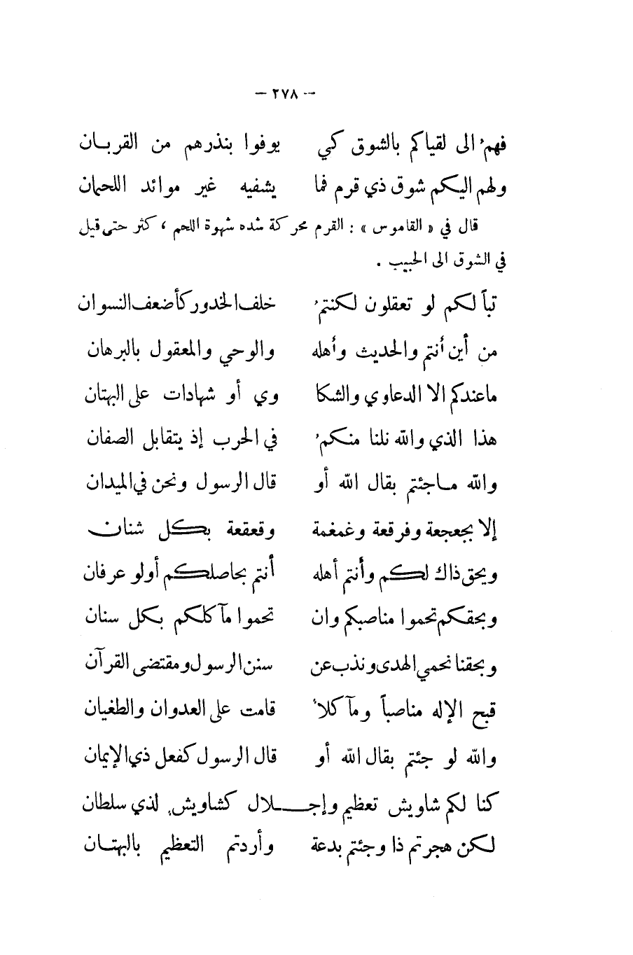 قَالَ فِي الْقَامُوس القرم محركة شدَّة شَهْوَة اللَّحْم كثر حَتَّى قيل فِي الشوق الى الحبيب ... تَبًّا لكم لَو تعقلون لكنتم ... خلف الْخُدُور كأضعف النسوان