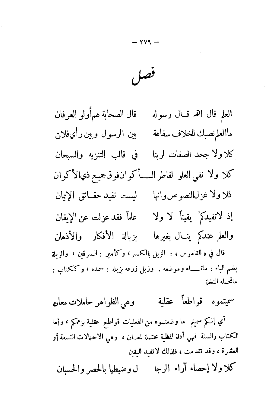 كلا وَلَا نفي الْعُلُوّ لفاطر الأكوان فَوق جَمِيع الأكوان ... كلا وَلَا عزل النُّصُوص وانها ... لَيست تفِيد حقائق الايمان ... إِذْ لَا تفيدكم يَقِينا لَا وَلَا ... علما فقد عزلت عَن الإيقان