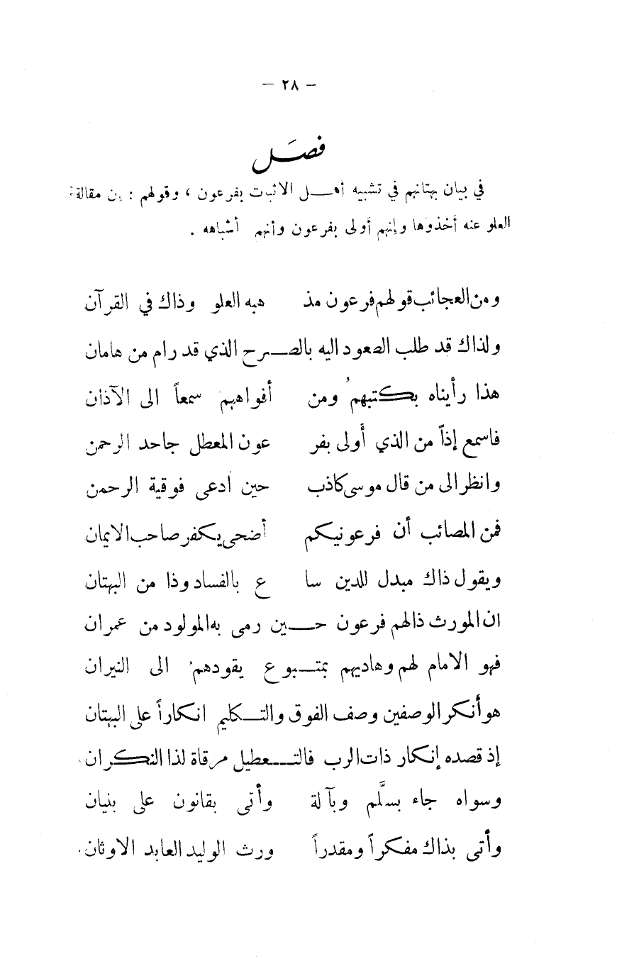 فِي بَيَان بهتانهم فِي تَشْبِيه أهل الاثبات بفرعون وَقَوْلهمْ إِن مقَالَة الْعُلُوّ عَنهُ أخذوها وَإِنَّهُم أولى بفرعون وَأَنَّهُمْ أشباهه ... وَمن الْعَجَائِب قَوْلهم فِرْعَوْن مذ ... هبه الْعُلُوّ وَذَاكَ فِي الْقُرْآن ... ولذاك قد طلب الصعُود اليه بالصرح الَّذِي قد رام من هامان