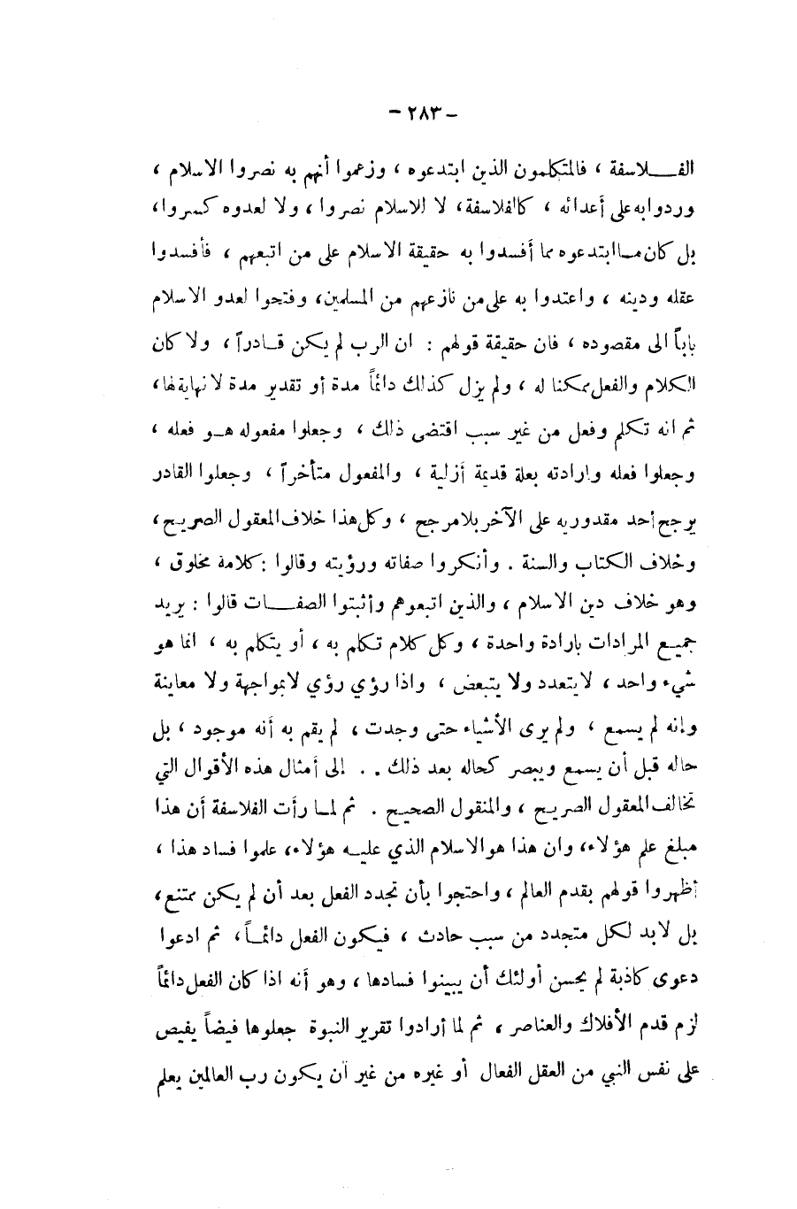 الفلاسفة فالمتكلمون الَّذين ابتدعوه وَزَعَمُوا أَنهم بِهِ نصروا الاسلام وردوا بِهِ على أعدائه كالفلاسفة لَا للاسلام نصروا وَلَا لعَدوه كسروا بل كَانَ مَا ابتدعوه مِمَّا افسدوا بِهِ حَقِيقَة الاسلام على من تَبِعَهُمْ فأفسدوا عقله وَدينه واعتدوا بِهِ على من نازعهم من الْمُسلمين وفتحوا لعدو الاسلام بَابا إِلَى مَقْصُوده فان حَقِيقَة قَوْلهم ان الرب لم يكن قَادِرًا وَلَا كَانَ الْكَلَام وَالْفِعْل مُمكنا لَهُ وَلم يزل كَذَلِك دَائِما مُدَّة اَوْ تَقْدِير مُدَّة لَا نِهَايَة لَهَا ثمَّ انه تكلم وَفعل من غير سَبَب اقْتضى ذَلِك وَجعلُوا مَفْعُوله هُوَ فعله وَجعلُوا فعله وارادته بعلة قديمَة أزلية وَالْمَفْعُول مُتَأَخِّرًا وجلوا الْقَادِر يرجح أحد مقدوريه على الآخر بِلَا مُرَجّح وكل هَذَا خلاف الْمَعْقُول الصَّرِيح وَخلاف الْكتاب السّنة وأنكروا صِفَاته ورؤيته وَقَالُوا ورؤيته وَقَالُوا كَلَامه مَخْلُوق وَهُوَ خلاف دين الاسلام وَالَّذين اتَّبَعُوهُمْ وأثبتوا الصِّفَات قَالُوا يُرِيد جَمِيع المرادات بارادة وَاحِدَة وكل كَلَام تكلم بِهِ أَو يتَكَلَّم بِهِ انما هُوَ شَيْء وَاحِد لَا يَتَعَدَّد وَلَا يَتَبَعَّض واذا رُؤِيَ رُؤِيَ لَا بمواجهة وَلَا مُعَاينَة وَإنَّهُ لم يسمع وَلم يرى الاشياء حَتَّى وجدت لم يقم بِهِ انه مَوْجُود بل حَاله قبل ان يسمع ويبصر كحاله بعد ذَلِك الى امثال هَذِه الْأَقْوَال الَّتِي تخَالف الْمَعْقُول الصَّرِيح وَالْمَنْقُول الصَّحِيح ثمَّ لما رَأَتْ الفلاسفة ان هَذَا مبلغ علم هَؤُلَاءِ وان هَذَا هُوَ الاسلام الَّذِي عَلَيْهِ هَؤُلَاءِ علمُوا فَسَاد هَذَا أظهرُوا قَوْلهم بقدم الْعَالم وَاحْتَجُّوا بِأَن تجدّد الْفِعْل بعد ان لم يكن مُمْتَنع بل لَا بُد لكل متجدد من سَبَب حَادث فَيكون الْفِعْل دَائِما ثمَّ ادعوا دَعْوَى كَاذِبَة لم يحسن أُولَئِكَ أَن يبينوا فَسَادهَا وَهُوَ أَنه إِذا كَانَ الْفِعْل دَائِما لزم قدم الأفلاك والعناصر ثمَّ لما أَرَادوا تَقْرِير النُّبُوَّة جعلوها فيضا يفيص على نفس النَّبِي من الْعقل الفعال أَو غَيره من غير ان يكون رب الْعَالمين يعلم