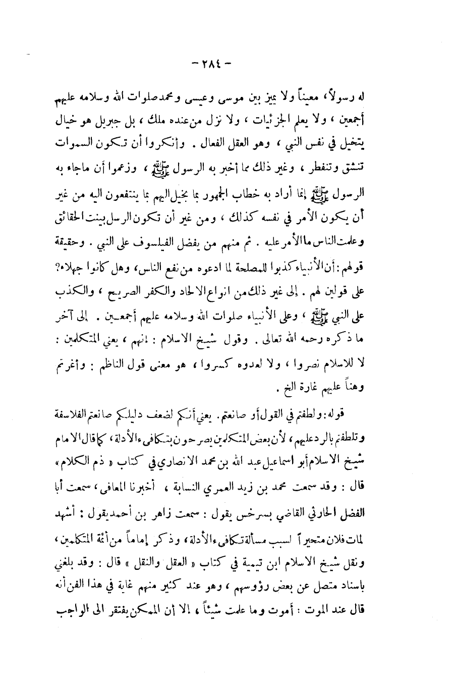 لَهُ رَسُولا معينا وَلَا يُمَيّز بَين مُوسَى وَعِيسَى وَمُحَمّد صلوَات الله وَسَلَامه عَلَيْهِم أَجْمَعِينَ وَلَا يعلم الجزئيات وَلَا نزل من عِنْده ملك بل جِبْرِيل هُوَ خيال يتخيل فِي نفس النَّبِي وَهُوَ الْعقل الفعال وأنكروا ان تكون السَّمَاوَات تَنْشَق وتنفطر وَغير ذَلِك مِمَّا اخبر بِهِ الرَّسُول صلى الله عَلَيْهِ وَسلم وَزَعَمُوا ان مَا جَاءَ بِهِ الرَّسُول صلى الله عَلَيْهِ وَسلم إِنَّمَا أَرَادَ بِهِ خطاب الْجُمْهُور بِمَا يخيل اليهم بِمَا يَنْتَفِعُونَ اليه من غير ان يكون الامر فِي نَفسه كَذَلِك وَمن غير ان تكون الرُّسُل بيّنت الْحَقَائِق وَعلمت النَّاس مَا الامر عَلَيْهِ ثمَّ مِنْهُم من يفضل الفيلسوف على النَّبِي وَحَقِيقَة قَوْلهم ان الانبياء كذبُوا للْمصْلحَة لما ادعوهُ من نفع النَّاس وَهل كَانُوا جهلاء على قَوْلَيْنِ لَهُم إِلَى غير ذَلِك من انواع الالحاد وَالْكفْر الصَّرِيح وَالْكذب على النَّبِي صلى الله عَلَيْهِ وَسلم وعَلى الانبياء صلوَات الله وَسَلَامه عَلَيْهِم أَجْمَعِينَ إِلَى آخر مَا ذكره رَحمَه الله تَعَالَى وَقَول شيخ الاسلام إِنَّهُم يَعْنِي الْمُتَكَلِّمين لَا للاسلام نصروا وَلَا لعَدوه كسروا هُوَ معنى قَول النَّاظِم وأغرتم وَهنا عَلَيْهِم غَارة الخ
