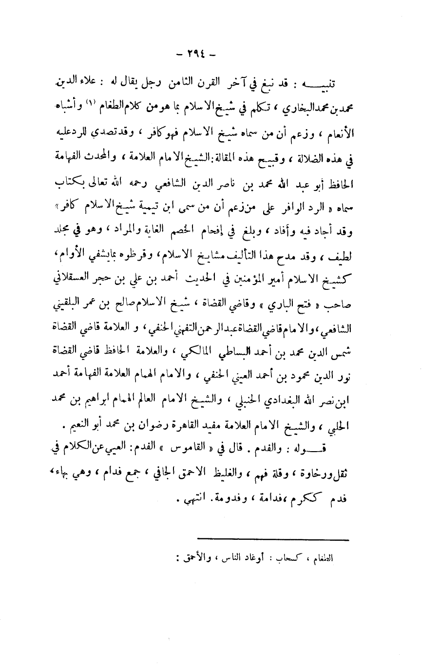 تَنْبِيه قد نبغ فِي آخر الْقرن الثَّامِن رجل يُقَال لَهُ عَلَاء الدّين مُحَمَّد بن مُحَمَّد البُخَارِيّ تكلم فِي شيخ الاسلام بِمَا هُوَ من كَلَام الطغام وَأَشْبَاه الْأَنْعَام وَزعم أَن من سَمَّاهُ شيخ الاسلام فَهُوَ كَافِر وَقد تصدى للرَّدّ عَلَيْهِ فِي هَذِه الضَّلَالَة وقبيح هَذِه الْمقَالة الشَّيْخ الامام الْعَلامَة والمحدث الفهامة الْحَافِظ ابو عبد الله مُحَمَّد بن نَاصِر الدّين الشَّافِعِي رَحمَه الله تَعَالَى بِكِتَاب سَمَّاهُ الرَّد الوافر على من زعم أَن من سمى ابْن تَيْمِية شيخ الاسلام كَافِر وَقد أَجَاد فِيهِ وَأفَاد وَبلغ فِي إفحام الْخصم الْغَايَة وَالْمرَاد وَهُوَ فِي مُجَلد لطيف وَقد مدح هَذَا التَّأْلِيف مَشَايِخ الاسلام وقرظوه بِمَا يشفي الأوام كشيخ الاسلام أَمِير الْمُؤمنِينَ فِي الحَدِيث أَحْمد بن عَليّ بن حجر الْعَسْقَلَانِي صَاحب فتح الْبَارِي وقاضي الْقُضَاة شيخ الاسلام صَالح بن عمر البُلْقِينِيّ الشَّافِعِي والامام قَاضِي الْقُضَاة عبد الرَّحْمَن التفهني الْحَنَفِيّ والعلامة قَاضِي الْقُضَاة شمس الدّين مُحَمَّد بن أَحْمد الْبِسَاطِيّ الْمَالِكِي والعلامة الْحَافِظ قَاضِي الْقُضَاة نور الدّين مَحْمُود بن أَحْمد الْعَيْنِيّ الْحَنَفِيّ والامام الْهمام الْعَلامَة الفهامة أَحْمد ابْن نصر الله الْبَغْدَادِيّ الْحَنْبَلِيّ وَالشَّيْخ الامام الْعَالم الْهمام ابراهيم بن مُحَمَّد الْحلَبِي وَالشَّيْخ الامام الْعَلامَة مُفِيد الْقَاهِرَة رضوَان بن مُحَمَّد أَبُو النَّعيم قَوْله والفدم قَالَ فِي الْقَامُوس الفدم العيي عَن الْكَلَام فِي ثقل ورخاوة وَقلة فهم والغليظ الاحمق الجافي جمع فدام وَهِي بهاء فدم ككرم فدامة وفدومة انْتهى