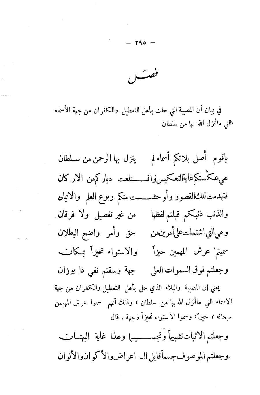 يَعْنِي أَن الْمُصِيبَة وَالْبَلَاء الَّذِي حل بِأَهْل التعطيل والكفران من جِهَة الاسماء الَّتِي مَا أنزل الله بهَا من سُلْطَان وَذَلِكَ أَنهم سموا عرش الْمُهَيْمِن سُبْحَانَهُ حيزا وَسموا الاسْتوَاء تحيزا وجهة قَالَ ... وجعلتم الاثبات تَشْبِيها وتجسيما وَهَذَا غَايَة الْبُهْتَان ... وجعلتم الْمَوْصُوف جسما قَابل الاعراض والاكوان والألوان ...
