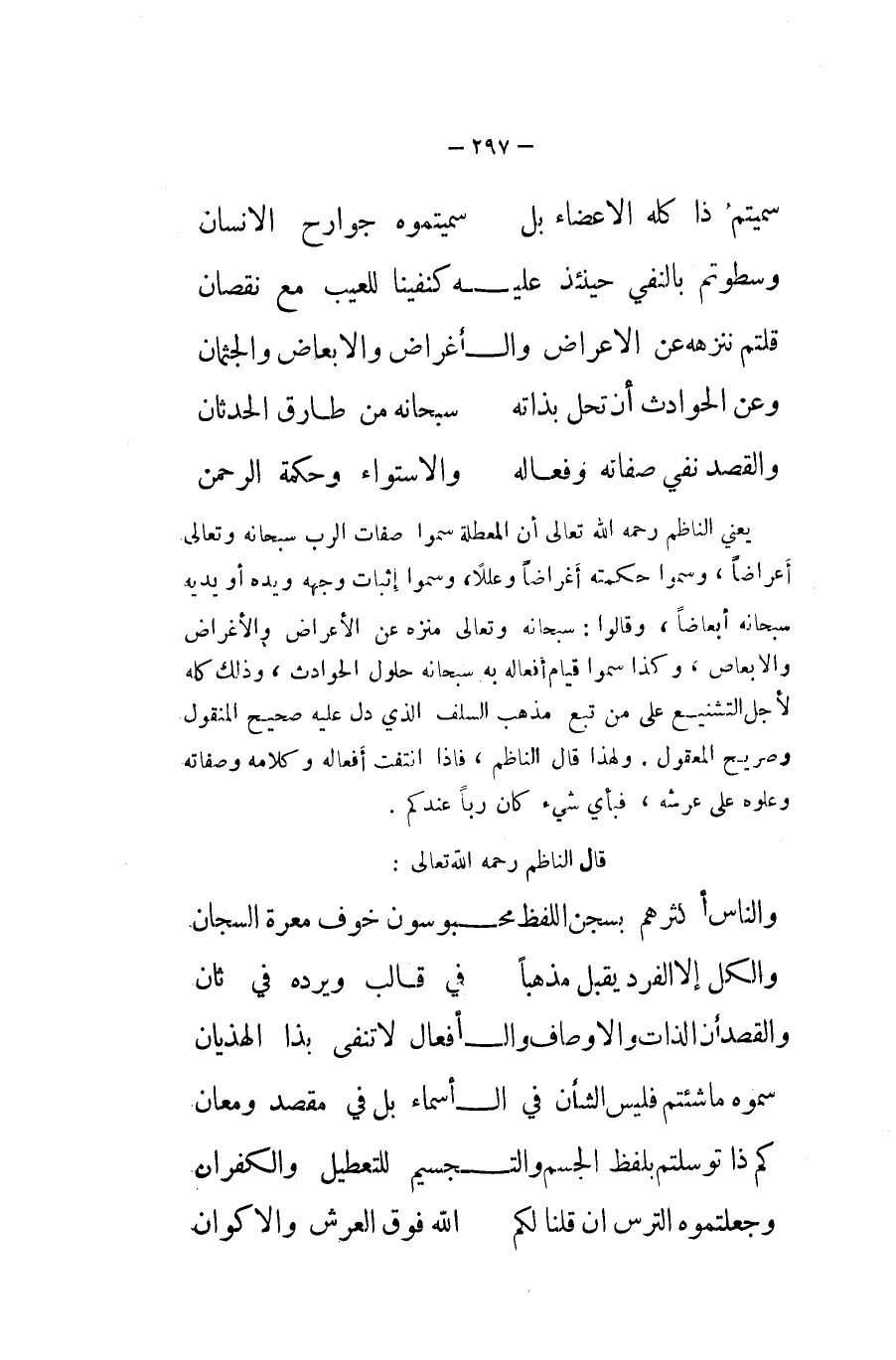 وسطوتم بِالنَّفْيِ حِينَئِذٍ عَلَيْهِ كنفينا للعيب مَعَ نُقْصَان ... قُلْتُمْ ننزهه عَن الاعراض والأغراض والابعاض والجثمان