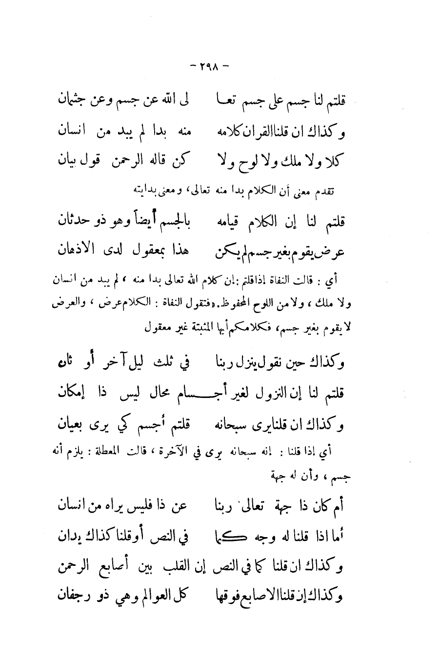 أَي قَالَت النفاة إِذْ قُلْتُمْ إِن كَلَام الله تَعَالَى بدا مِنْهُ لم يبد من انسان وَلَا ملك وَلَا من اللَّوْح الْمَحْفُوظ فَتَقول النفاة الْكَلَام عرض وَالْعرض لَا يقوم بِغَيْر جسم فكلامكم أَيهَا المثبتة غير مَعْقُول ... وكذاك حِين نقُول ينزل رَبنَا ... فِي ثلث ليل آخر أَو ثَان