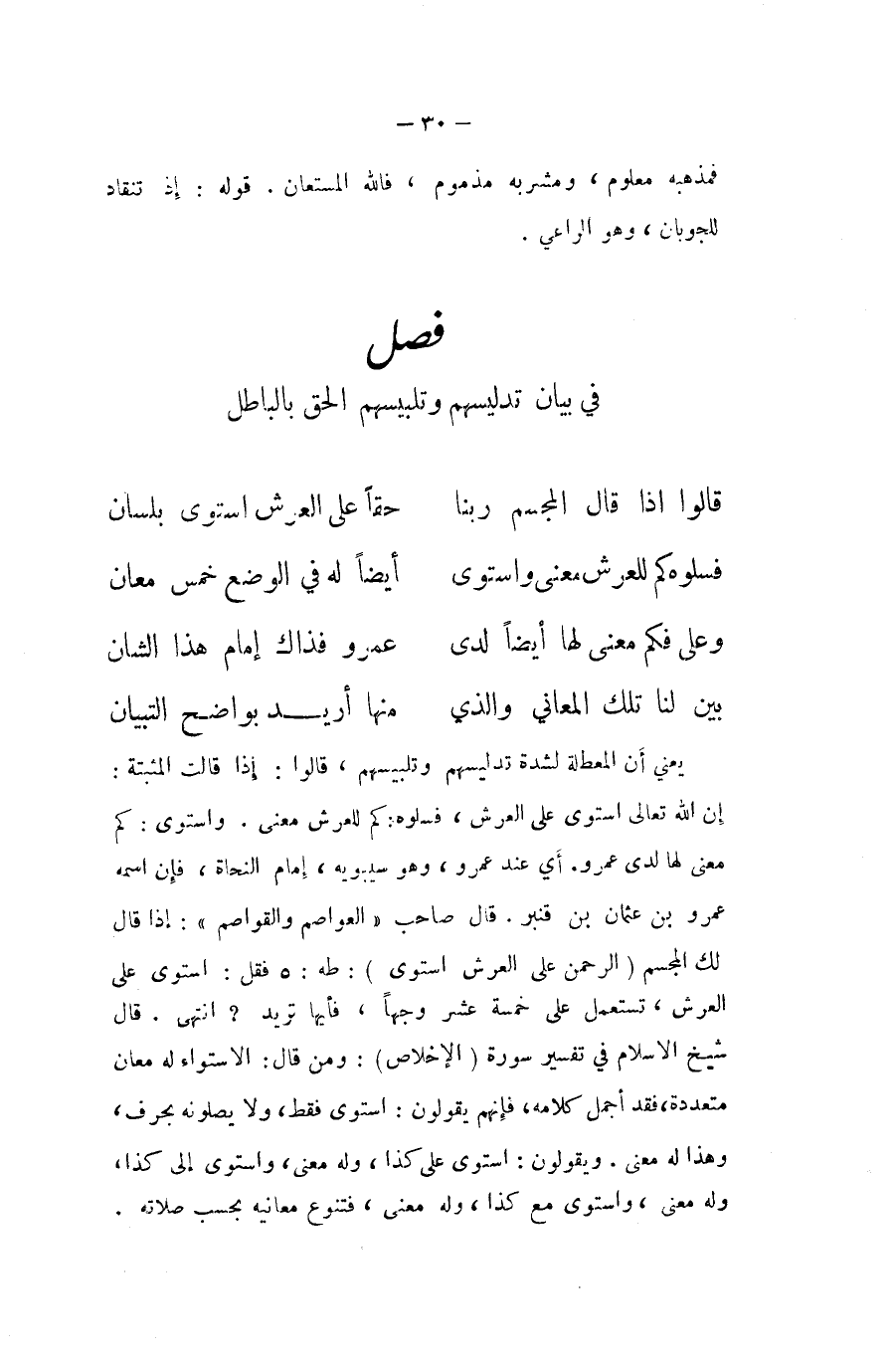 ... قَالُوا اذا قَالَ المجسم رَبنَا ... حَقًا على الْعَرْش اسْتَوَى بِلِسَان ... فسلوه كم للعرش معنى واستوى ... أَيْضا لَهُ فِي الْوَضع خمس معَان ... وعَلى فكم معنى لَهَا أَيْضا لَدَى ... عَمْرو فَذَاك إِمَام هَذَا الشان