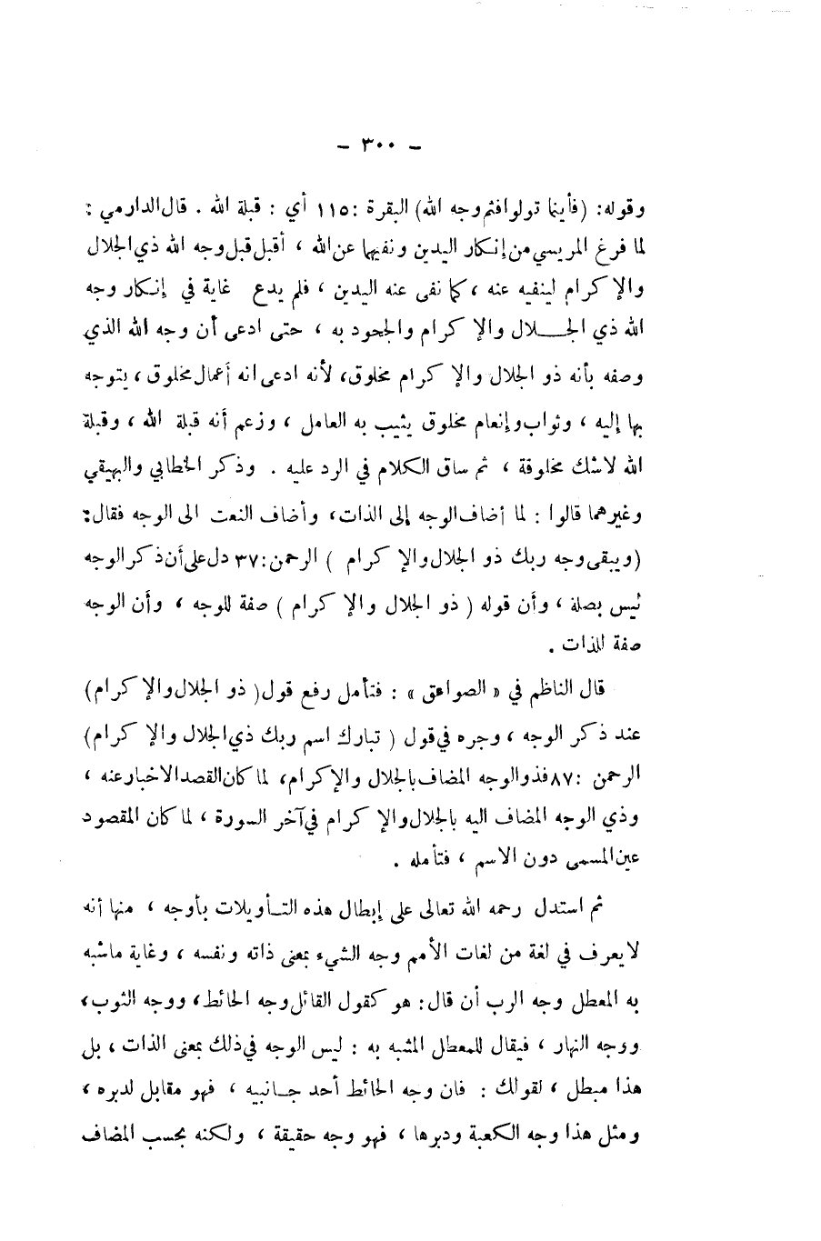 وَقَوله {فأينما توَلّوا فثم وَجه الله} الْبَقَرَة أَي قبْلَة الله قَالَ الدَّارمِيّ لما فرغ المريسي من إِنْكَار الْيَدَيْنِ ونفيهما عَن الله أقبل قبل وَجه الله ذِي الْجلَال وَالْإِكْرَام لينفيه عَنهُ كَمَا نفى عَنهُ الْيَدَيْنِ فَلم يدع غَايَة فِي إِنْكَار وَجه الله ذِي الْجلَال وَالْإِكْرَام والجحود بِهِ حَتَّى ادّعى ان وَجه الله الَّذِي وَصفه بِأَنَّهُ ذُو الْجلَال وَالْإِكْرَام مَخْلُوق لِأَنَّهُ ادّعى انه أَعمال مَخْلُوق يتَوَجَّه بهَا إِلَيْهِ وثواب وإنعام مَخْلُوق يثيب بِهِ الْعَامِل وَزعم أَنه قبْلَة الله وقبلة الله لَا شكّ مخلوقة ثمَّ سَاق الْكَلَام فِي الرَّد عَلَيْهِ وَذكر الْخطابِيّ وَالْبَيْهَقِيّ وَغَيرهمَا قَالُوا لما اضاف الْوَجْه إِلَى الذَّات وأضاف النَّعْت الى الْوَجْه فَقَالَ {وَيبقى وَجه رَبك ذُو الْجلَال وَالْإِكْرَام} الرَّحْمَن دلّ على أَن ذكر الْوَجْه لَيْسَ بصلَة وَأَن قَوْله {ذُو الْجلَال وَالْإِكْرَام} صفة للْوَجْه وَأَن الْوَجْه صفة للذات