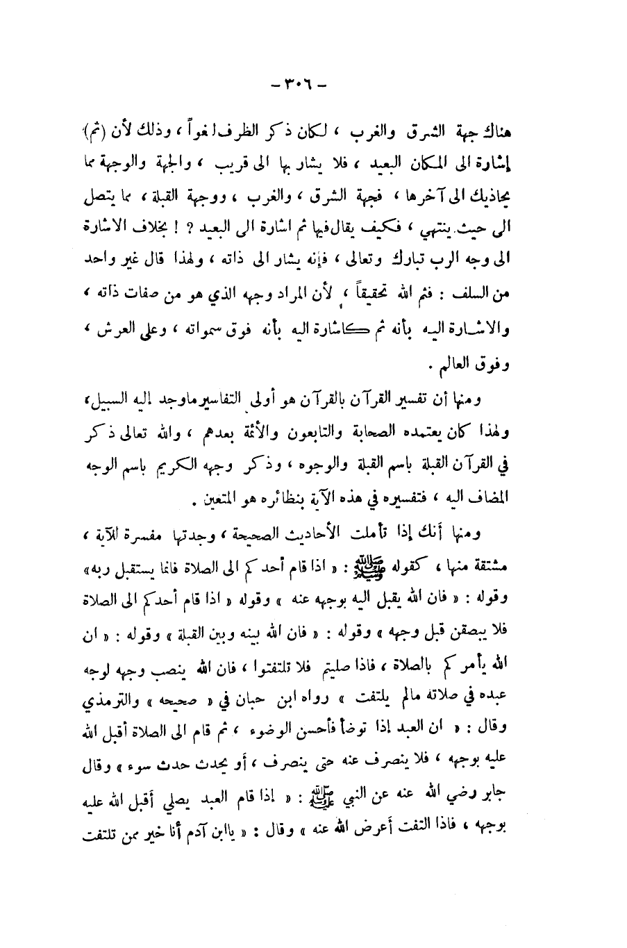 هُنَاكَ جِهَة الشرق والغرب لَكَانَ ذكر الظّرْف لَغوا وَذَلِكَ لِأَن ثمَّ إِشَارَة الى الْمَكَان الْبعيد فَلَا يشار بهَا الى قريب والجهة والوجهة مِمَّا يحاذيك الى آخرهَا فجهة الشرق والغرب ووجهة الْقبْلَة مِمَّا يتَّصل الى حَيْثُ يَنْتَهِي فَكيف يُقَال فِيهَا ثمَّ اشارة الى الْبعيد بِخِلَاف الاشارة الى وَجه الرب تبَارك وَتَعَالَى فَإِنَّهُ يشار الى ذَاته وَلِهَذَا قَالَ غير وَاحِد من السّلف فثم الله تَحْقِيقا لَان المُرَاد وَجهه الَّذِي هُوَ من صِفَات ذَاته والاشارة اليه بِأَنَّهُ ثمَّ كاشارة اليه بِأَنَّهُ فَوق سمواته وعَلى الْعَرْش وَفَوق الْعَالم