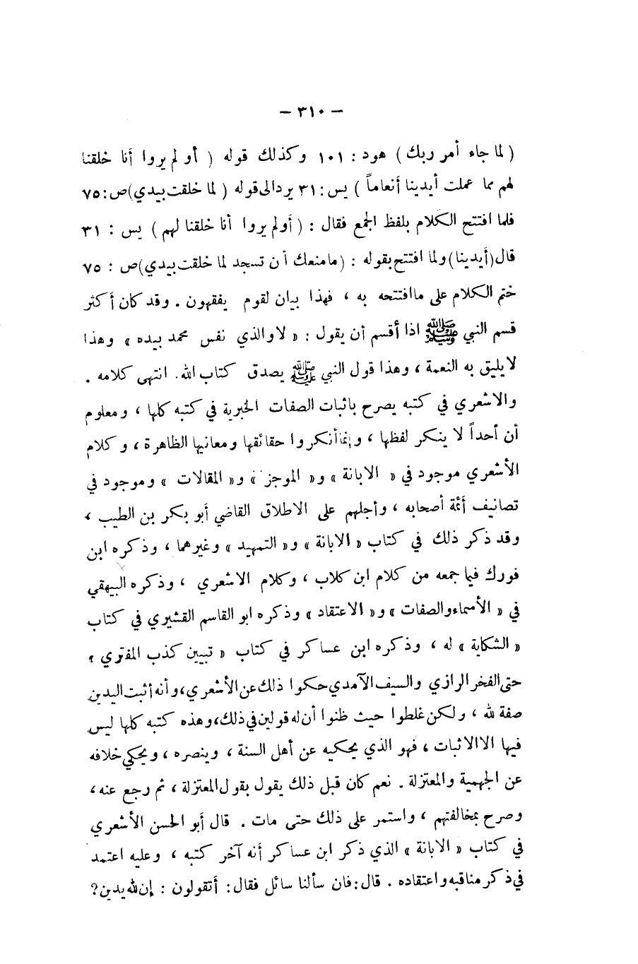 {لما جَاءَ أَمر رَبك} هود وَكَذَلِكَ قَوْله {أَو لم يرَوا أَنا خلقنَا لَهُم مِمَّا عملت أَيْدِينَا أنعاما} يس يرد إِلَى قَوْله {لما خلقت بيَدي} فَلَمَّا افْتتح الْكَلَام بِلَفْظ الْجمع فَقَالَ {أَو لم يرَوا أَنا خلقنَا لَهُم} يس قَالَ أَيْدِينَا وَلما افْتتح بقوله مَا مَنعك ان تسْجد لما خلقت بيَدي ختم الْكَلَام على مَا افتتحه بِهِ فَهَذَا بَيَان لقوم يفقهُونَ وَقد كَانَ أَكثر قسم النَّبِي صلى الله عَلَيْهِ وَسلم اذا أقسم أَن يَقُول لَا وَالَّذِي نفس مُحَمَّد بِيَدِهِ وَهَذَا لَا يَلِيق بِهِ النِّعْمَة وَهَذَا قَول النَّبِي صلى الله عَلَيْهِ وَسلم يصدق كتاب الله انْتهى كَلَامه الْأَشْعَرِيّ فِي كتبه يُصَرح باثبات الصِّفَات الخبرية فِي كتبه كلهَا وَمَعْلُوم أَن أحدا لَا يُنكر لَفظهَا وَإِنَّمَا أَنْكَرُوا حقائقها ومعانيها الظَّاهِرَة وَكَلَام الْأَشْعَرِيّ مَوْجُود فِي الابانة والموجز والمقالات وموجود فِي تصانيف أَئِمَّة أَصْحَابه وأجلهم على الاطلاق القَاضِي أَبُو بكر بن الطّيب وَقد ذكر ذَلِك فِي كتاب الابانة والتمهيد وَغَيرهمَا وَذكره ابْن فورك فِيمَا جمعه من كَلَام ابْن كلاب وَكَلَام الْأَشْعَرِيّ وَذكره الْبَيْهَقِيّ فِي الْأَسْمَاء وَالصِّفَات والاعتقاد وَذكره ابو الْقَاسِم الْقشيرِي فِي كتاب الشكاية لَهُ وَذكره ابْن عَسَاكِر فِي كتاب تَبْيِين كذب المفتري حَتَّى الْفَخر الرَّازِيّ وَالسيف الْآمِدِيّ حكوا ذَلِك عَن الْأَشْعَرِيّ وَأَنه أثبت الْيَدَيْنِ صفة لله وَلَكِن غلطوا حَيْثُ ظنُّوا أَن لَهُ قَوْلَيْنِ فِي ذَلِك وَهَذِه كتبه كلهَا لَيْسَ فِيهَا الا الاثبات فَهُوَ الَّذِي يحكيه عَن أهل السّنة وينصره ويحكي خِلَافه عَن الْجَهْمِية والمعتزلة نعم كَانَ قبل ذَلِك يَقُول بقول الْمُعْتَزلَة ثمَّ رَجَعَ عَنهُ وَصرح بمخالفتهم وَاسْتمرّ على ذَلِك حَتَّى مَاتَ قَالَ ابو الْحسن الْأَشْعَرِيّ فِي كتاب الابانة الَّذِي ذكر ابْن عَسَاكِر أَنه آخر كتبه وَعَلِيهِ اعْتمد فِي ذكر مناقبه واعتقاده قَالَ فان سَأَلنَا سَائل فَقَالَ أتقولون إِن لله يدين