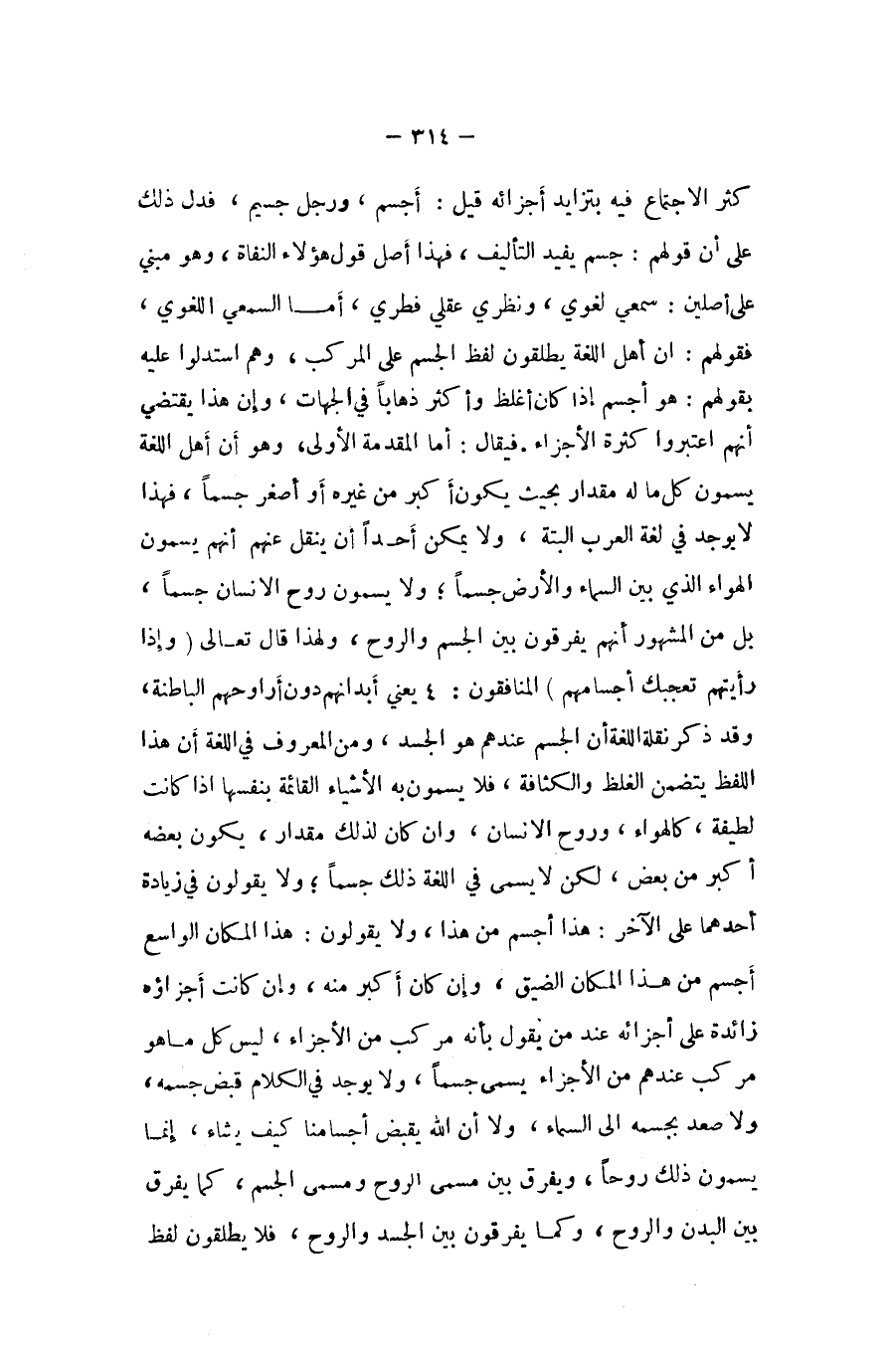 كثر الِاجْتِمَاع فِيهِ بتزايد اجزائه قيل أجسم وَرجل جسيم فَدلَّ ذَلِك على أَن قَوْلهم جسم يُفِيد التَّأْلِيف فَهَذَا أصل قَول هَؤُلَاءِ النفاة وَهُوَ مَبْنِيّ على أصلين سَمْعِي لغَوِيّ ونظري عَقْلِي فطري أما السمعي اللّغَوِيّ فَقَوْلهم أَن أهل اللُّغَة يطلقون لفظ الْجِسْم على الْمركب وهم استدلوا عَلَيْهِ بقَوْلهمْ هُوَ أجسم إِذا كَانَ أغْلظ وَأكْثر ذَهَابًا فِي الْجِهَات وَإِن هَذَا يَقْتَضِي أَنهم اعتبروا كَثْرَة الْأَجْزَاء فَيُقَال اما الْمُقدمَة الأولى هُوَ ان اهل اللُّغَة يسمون كل مَا لَهُ مِقْدَار بِحَيْثُ يكون أكبر من غَيره أَو أَصْغَر جسما فَهَذَا لَا يُوجد فِي لُغَة الْعَرَب الْبَتَّةَ وَلَا يُمكن أحدا ان ينْقل عَنْهُم انهم يسمون الْهَوَاء الَّذِي بَين السَّمَاء وَالْأَرْض جسما وَلَا يسمون روح الانسان جسما بل من الْمَشْهُور أَنهم يفرقون بَين الْجِسْم وَالروح وَلِهَذَا قَالَ تَعَالَى {وَإِذا رَأَيْتهمْ تعجبك أجسامهم} المُنَافِقُونَ 4 يَعْنِي أبدانهم دون أَرْوَاحهم الْبَاطِنَة وَقد ذكر نَقله اللُّغَة ان الْجِسْم عِنْدهم هُوَ الْجَسَد وَمن الْمَعْرُوف فِي اللُّغَة أَن هَذَا اللَّفْظ يتَضَمَّن الْغَلَط والكثافة فَلَا يسمون بِهِ الْأَشْيَاء الْقَائِمَة بِنَفسِهَا اذا كَانَت لَطِيفَة كالهواء وروح الانسان وان كَانَ لذَلِك مِقْدَار يكون بعضه أكبر من بعض لَكِن لَا يُسمى فِي اللُّغَة ذَلِك جسما وَلَا يَقُولُونَ هَذَا الْمَكَان الْوَاسِع أجسم من هَذَا الْمَكَان الضّيق وَإِن كَانَ أكبر مِنْهُ وَإِن كَانَت أجزاؤه زَائِدَة على أَجْزَائِهِ عِنْد من يَقُول بِأَنَّهُ مركب من الْأَجْزَاء لَيْسَ كل مَا هُوَ مركب عِنْدهم من الْأَجْزَاء يُسمى جسما وَلَا يُوجد فِي الْكَلَام قبض جِسْمه وَلَا صعد بجسمه الى السَّمَاء وَلَا أَن الله يقبض أجسامنا كَيفَ يَشَاء إِنَّمَا يسمون ذَلِك روحا وَيفرق بَين مُسَمّى الرّوح ومسمى الْجِسْم كَمَا يفرق بَين الْبدن وَالروح وكما يفرقون بَين الْجَسَد وَالروح فَلَا يطلقون لفظ