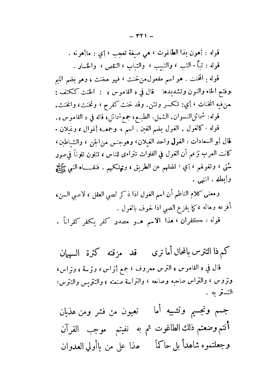 قَوْله اهون بذا الطاغوت هِيَ صِيغَة تعجب أَي مَا أهونه قَوْله تَبًّا التب والتبيب والتباب النَّقْص والخسار قَوْله المخنث هُوَ اسْم مفعول من خنث فَهُوَ مخنث وَهُوَ بِضَم الْمِيم وَفتح الْخَاء وَالنُّون وتشديدها قَالَ فِي الْقَامُوس الخنث ككتف من فِيهِ انخناث أَي تكسر وتثن وَقد خنث كفرح وتخنث وانخنث قَوْله شمائل النسوان الشمل الطَّبْع جمع شمائل قَالَه فِي الْقَامُوس قَوْله كالغول الغول بِضَم الْغَيْن اسْم وَجمعه أغوال وغيلان قَالَ أَبُو السعادات الغول وَاحِد الغيلان وَهُوَ جنس من الْجِنّ وَالشَّيَاطِين كَانَت الْعَرَب تزْعم أَن الغول فِي الفلوات تتراءى للنَّاس تتلون تلونا فِي صور شَتَّى وتغولهم أَي تضلهم عَن الطَّرِيق وتهلكهم فنفاه النَّبِي صلى الله عَلَيْهِ وَسلم وأبطله انْتهى وَمعنى كَلَام النَّاظِم ان اسْم الغول اذا ذكر لصبي الْعقل لَا صبي السن أفزعه وهاله كَمَا يفزع الصَّبِي اذا خوف بالغول قَوْله كفران هَذَا الِاسْم هُوَ مصدر كفر يكفر كفرانا ... كم ذَا التترس بالمحال أما ترى ... قد مزقته كَثْرَة السهْمَان ...