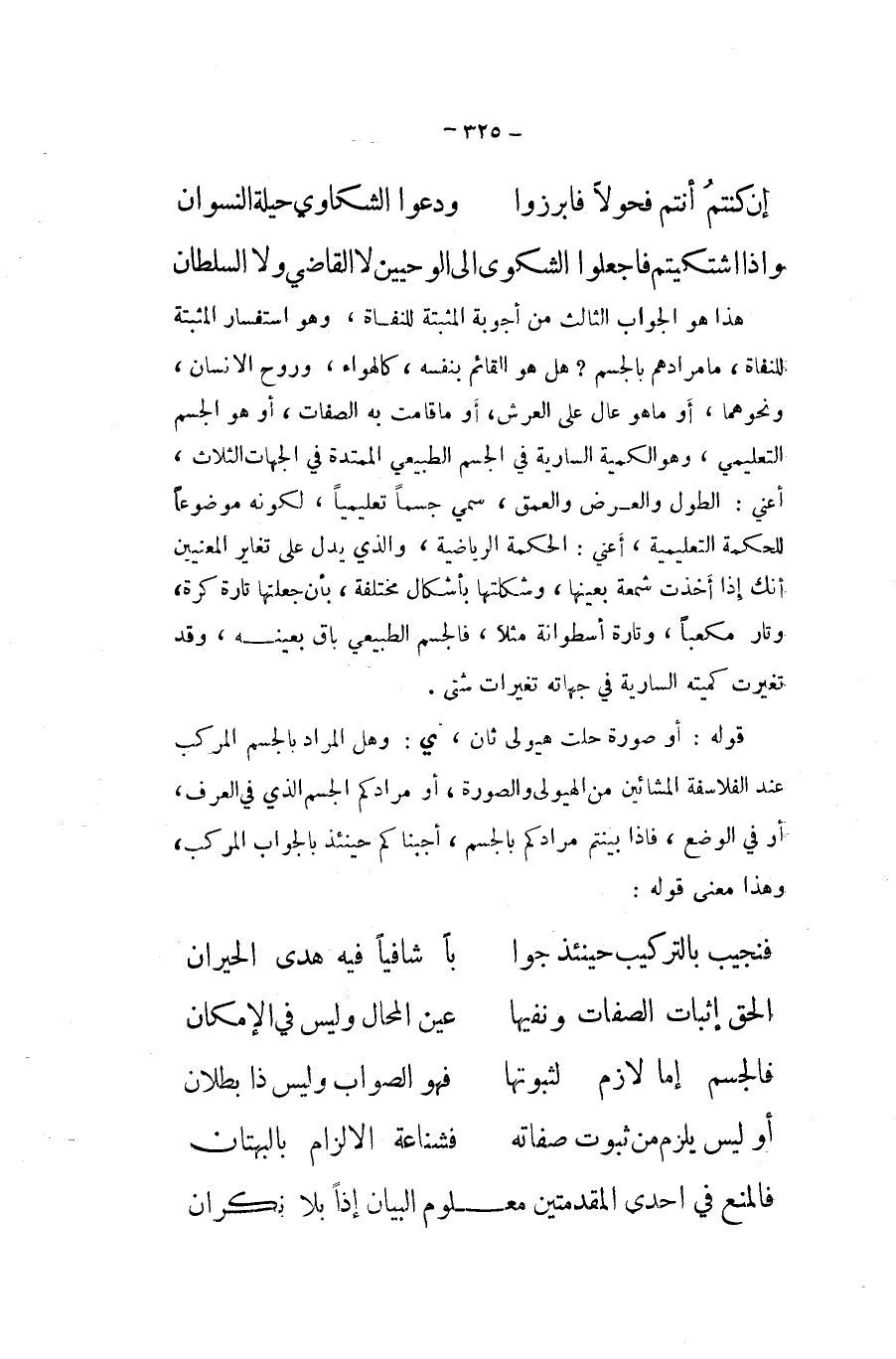 هَذَا هُوَ الْجَواب الثَّالِث من أجوبة المثبتة للنفاة وَهُوَ استفسار المثبتة للنفاة مَا مُرَادهم بالجسم هَل هُوَ الْقَائِم بِنَفسِهِ كالهواء وروح الانسان وَنَحْوهمَا اَوْ مَا هُوَ عَال على الْعَرْش أَو مَا قَامَت بِهِ الصِّفَات اَوْ هُوَ الْجِسْم التعليمي وَهُوَ الكمية السارية فِي الْجِسْم الطبيعي الممتدة فِي الْجِهَات الثَّلَاث أعنى الطول وَالْعرض والعمق سمي جسما تعليميا لكَونه مَوْضُوعا للحكمة التعليمية أَعنِي الْحِكْمَة الرياضية وَالَّذِي يدل على تغاير الْمَعْنيين أَنَّك إِذا أخذت شمعة بِعَينهَا وشكلتها بأشكال مُخْتَلفَة بِأَن جَعلتهَا تَارَة كرة وتار مكعبا وَتارَة اسطوانة مثلا فالجسم الطبيعي بَاقٍ بِعَيْنِه وَقد تَغَيَّرت كميته السارية فِي جهاته تغيرات شَتَّى