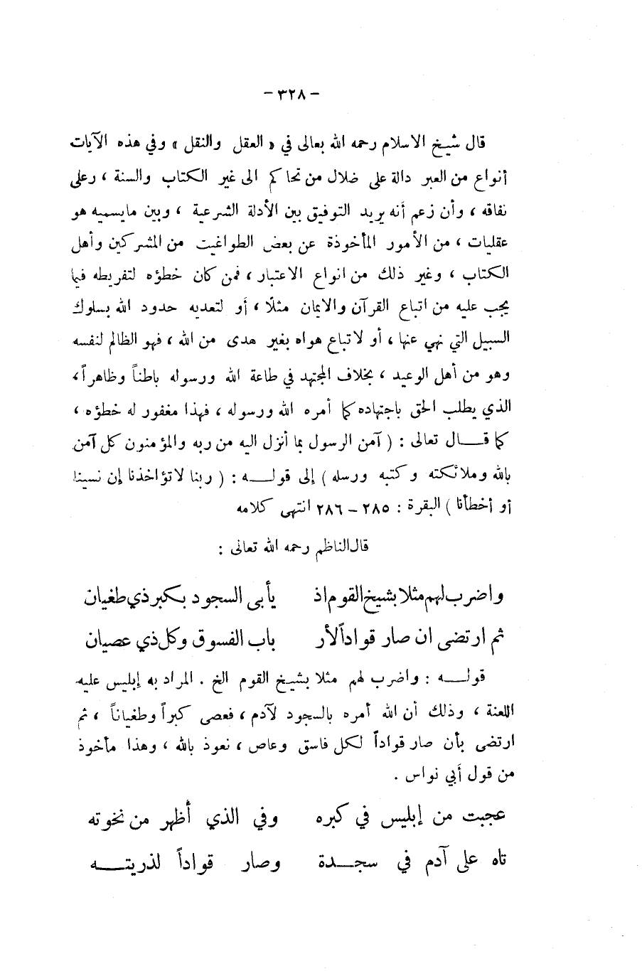 قَالَ شيخ الاسلام رَحمَه الله تَعَالَى فِي الْعقل وَالنَّقْل وَفِي هَذِه الْآيَات أَنْوَاع من العبر دَالَّة على ضلال من تحاكم الى غير الْكتاب وَالسّنة وعَلى نفاقة وان زعم انه يُرِيد التَّوْفِيق بَين الْأَدِلَّة الشَّرْعِيَّة وَبَين مَا يُسَمِّيه هُوَ عقليات من الْأُمُور الْمَأْخُوذَة عَن بعض الطواغيت من الْمُشْركين وَأهل الْكتاب وَغير ذَلِك من أَنْوَاع الِاعْتِبَار فَمن كَانَ خَطؤُهُ لتَفْرِيطه فِيمَا يجب عَلَيْهِ من اتِّبَاع الْقُرْآن والايمان مثلا أَو لتعديه حُدُود الله بسلوك السَّبِيل الَّتِي نهي عَنْهَا اَوْ لاتباع هَوَاهُ بِغَيْر هدى من الله فَهُوَ الظَّالِم لنَفسِهِ وَهُوَ من أهل الْوَعيد بِخِلَاف الْمُجْتَهد فِي طَاعَة الله وَرَسُوله بَاطِنا وظاهرا الَّذِي يطْلب الْحق بِاجْتِهَادِهِ كَمَا امْرَهْ الله وَرَسُوله فَهَذَا مغْفُور لَهُ خَطؤُهُ كَمَا قَالَ تَعَالَى {آمن الرَّسُول بِمَا أنزل إِلَيْهِ من ربه والمؤمنون كل آمن بِاللَّه وَمَلَائِكَته وَكتبه وَرُسُله} إِلَى قَوْله {رَبنَا لَا تُؤَاخِذنَا إِن نَسِينَا أَو أَخْطَأنَا} الْبَقَرَة انْتهى كَلَامه