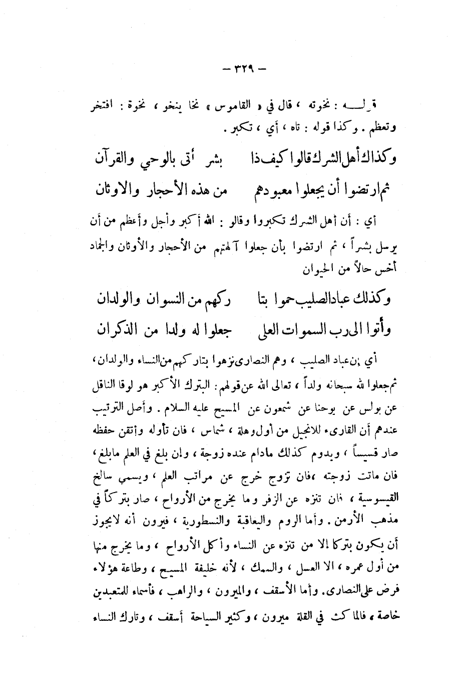 أَي أَن أهل الشّرك تكبروا وَقَالُوا الله أكبر وَأجل وَأعظم من أَن يُرْسل بشرا ثمَّ ارتضوا بِأَن جعلُوا آلِهَتهم من الْأَحْجَار والاوثان والجماد أخس حَالا من الْحَيَوَان ... وَكَذَلِكَ عباد الصَّلِيب حموا بتا ... ركهم من النسوان والولدان