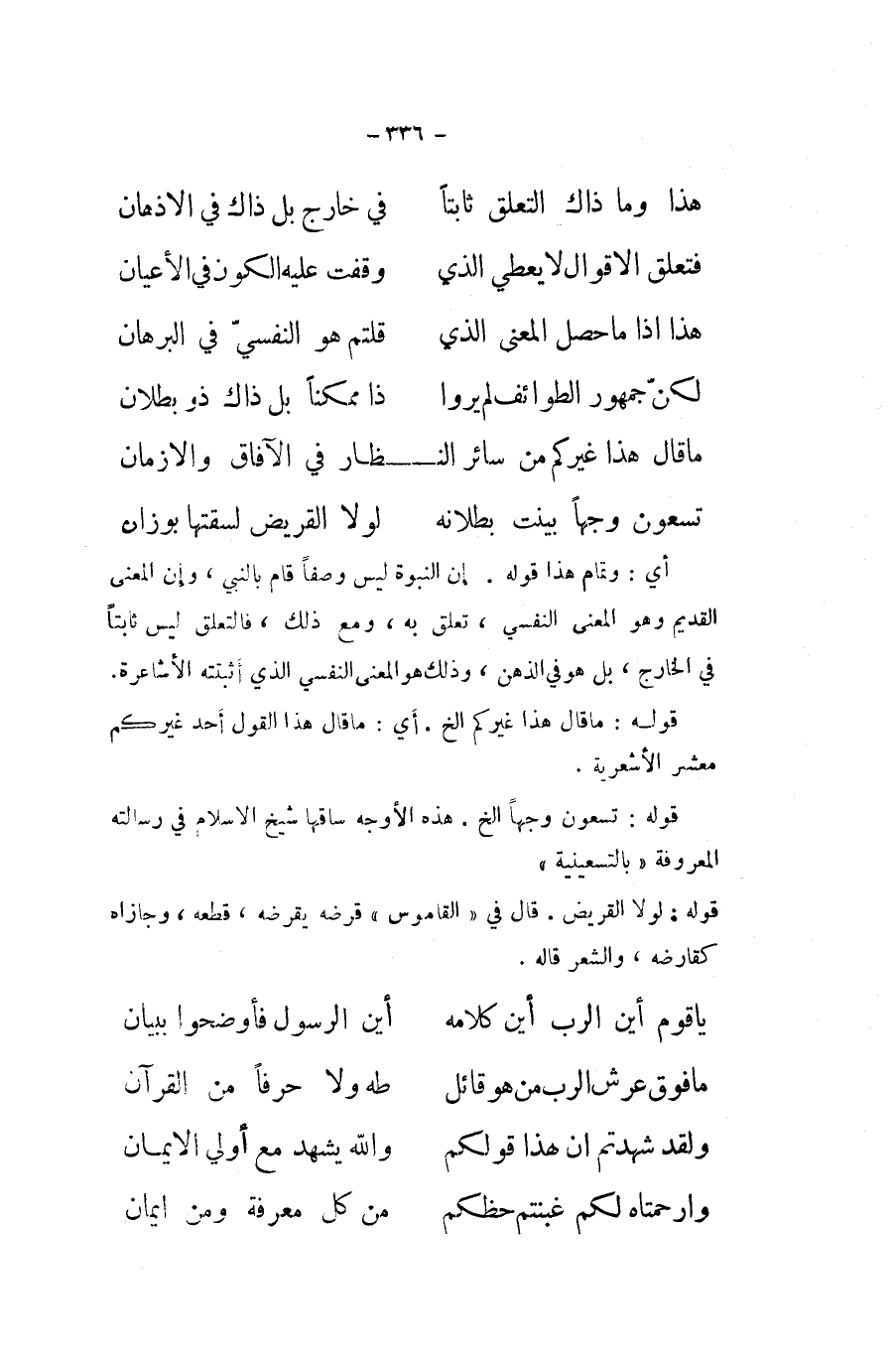 .. هَذَا وَمَا ذَاك التَّعَلُّق ثَابتا ... فِي خَارج بل ذَاك فِي الاذهان ... فَتعلق الاقوال لَا يُعْطي الَّذِي ... وقفت عَلَيْهِ الْكَوْن فِي الْأَعْيَان ... هَذَا اذا مَا حصل الْمَعْنى الَّذِي ... قُلْتُمْ هُوَ النَّفْسِيّ فِي الْبُرْهَان