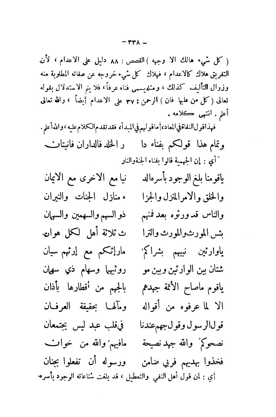 أَي إِن الْجَهْمِية قَالُوا بِفنَاء الْجنَّة وَالنَّار ... يَا قَومنَا بلغ الْوُجُود بأسره الد ... نيا مَعَ الْأُخْرَى مَعَ الايمان
