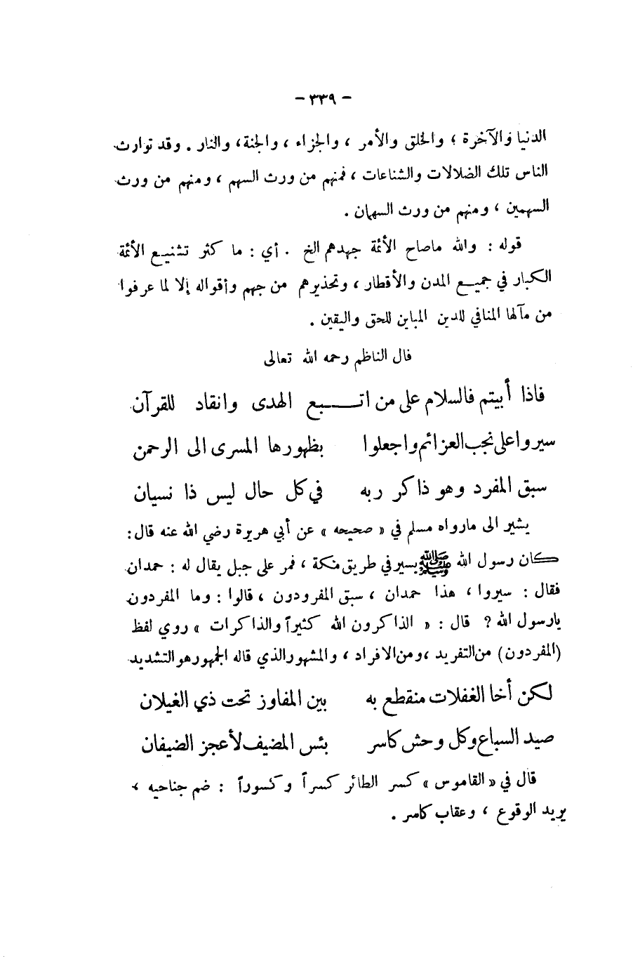 يُشِير الى مَا رَوَاهُ مُسلم فِي صَحِيحه عَن أبي هُرَيْرَة رَضِي الله عَنهُ قَالَ كَانَ رَسُول الله صلى الله عَلَيْهِ وَسلم يسير فِي طَرِيق مَكَّة فَمر على جبل يُقَال لَهُ حمدَان فَقَالَ سِيرُوا هَذَا حمدَان سبق المفرودن قَالُوا وَمَا المفردون يَا رَسُول الله قَالَ الذاكرون الله كثيرا وَالذَّاكِرَات رُوِيَ لفظ المفردون من التفريد وَمن الافراد وَالْمَشْهُور الَّذِي قَالَه الْجُمْهُور وَهُوَ التَّشْدِيد ... لَكِن أَخا الغفلات مُنْقَطع بِهِ ... بَين المفاوز تَحت ذِي الغيلان