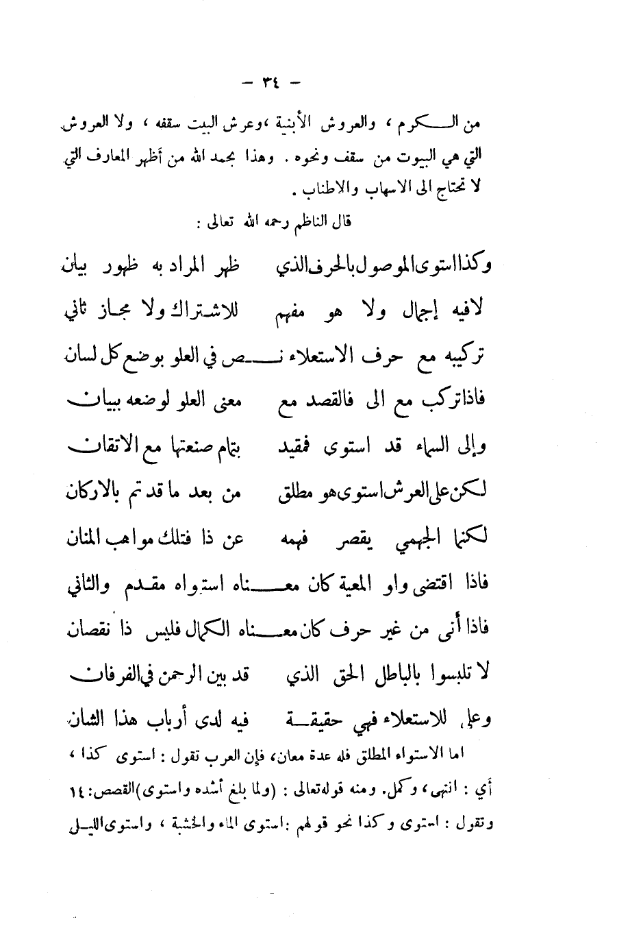 تركيبه مَعَ حرف الاستعلاء نَص فِي الْعُلُوّ بِوَضْع كل لِسَان ... فاذا تركب مَعَ الى فالقصد مَعَ ... معنى الْعُلُوّ لوضعه بِبَيَان ... وَإِلَى السَّمَاء قد اسْتَوَى فمقيد ... بِتمَام صنعتها مَعَ الاتقان
