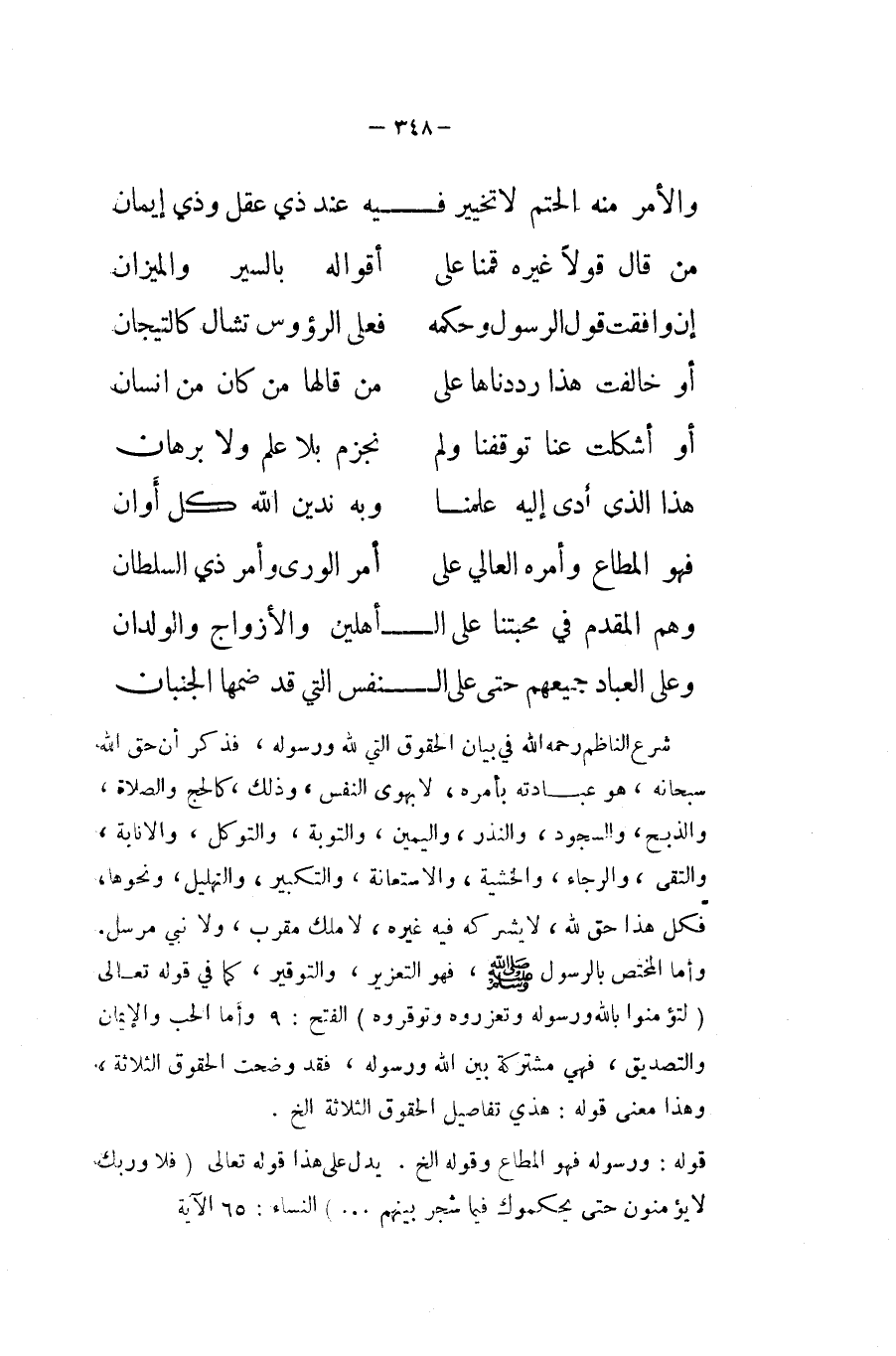 شرع النَّاظِم رَحمَه الله فِي بَيَان الْحُقُوق الَّتِي لله وَرَسُوله فَذكر أَن حق الله سُبْحَانَهُ هُوَ عِبَادَته بأَمْره لَا بهوى النَّفس وَذَلِكَ كَالْحَجِّ وَالصَّلَاة وَالذّبْح وَالسُّجُود وَالنّذر وَالْيَمِين وَالتَّوْبَة والتوكل والانابة والتقى والرجاء والخشية والاستعانة وَالتَّكْبِير والتهليل وَنَحْوهَا فَكل هَذَا حق لله لَا يشركهُ فِيهِ غَيره لَا ملك مقرب وَلَا نَبِي مُرْسل وَأما الْمُخْتَص بالرسول صلى الله عَلَيْهِ وَسلم فَهُوَ التعزيز والتوقير كَمَا فِي قَوْله تَعَالَى {لتؤمنوا بِاللَّه وَرَسُوله وتعزروه وتوقروه} الْفَتْح وَأما الْحبّ والايمان والتصديق فَهِيَ مُشْتَركَة بَين الله وَرَسُوله فقد وضحت الْحُقُوق الثَّلَاثَة وَهَذَا معنى قَوْله هذي تفاصيل الْحُقُوق الثَّلَاثَة الخ