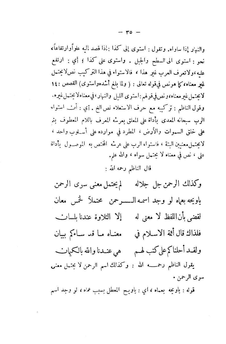 وَالنَّهَار إِذا ساواه وَتقول اسْتَوَى إِلَى كَذَا إِذا قصد إِلَيْهِ علوا وارتفاعا نَحْو اسْتَوَى إِلَى السَّطْح والجبل واستوى على كَذَا أَي ارْتَفع عَلَيْهِ وَلَا تعرف الْعَرَب غير هَذَا فالاستواء فِي هَذَا التَّرْكِيب نَص لَا يحْتَمل غير مَعْنَاهُ كَمَا هُوَ نَص فِي قَوْله تَعَالَى {وَلما بلغ أشده واستوى} الْقَصَص لَا يحْتَمل غير مَعْنَاهُ وَنَصّ فِي قَوْلهم اسْتَوَى اللَّيْل وَالنَّهَار فِي مَعْنَاهُ لَا يحْتَمل غَيره وَقَول النَّاظِم تركيبه مَعَ حرف الاستعلاء نَص الخ أَي ان اسْتِوَاء الرب سُبْحَانَهُ المعدى بأداة على الْمُعَلق بِعَرْشِهِ الْمُعَرّف بِاللَّامِ الْمَعْطُوف بثم على خلق السَّمَاوَات والارض المطرد فِي موارده على أسلوب وَاحِد لَا يحْتَمل مَعْنيين الْبَتَّةَ فاستواء الرب على عَرْشه الْمُخْتَص بِهِ الْمَوْصُول بأداة على نَص فِي مَعْنَاهُ لَا يحْتَمل سواهُ وَالله أعلم