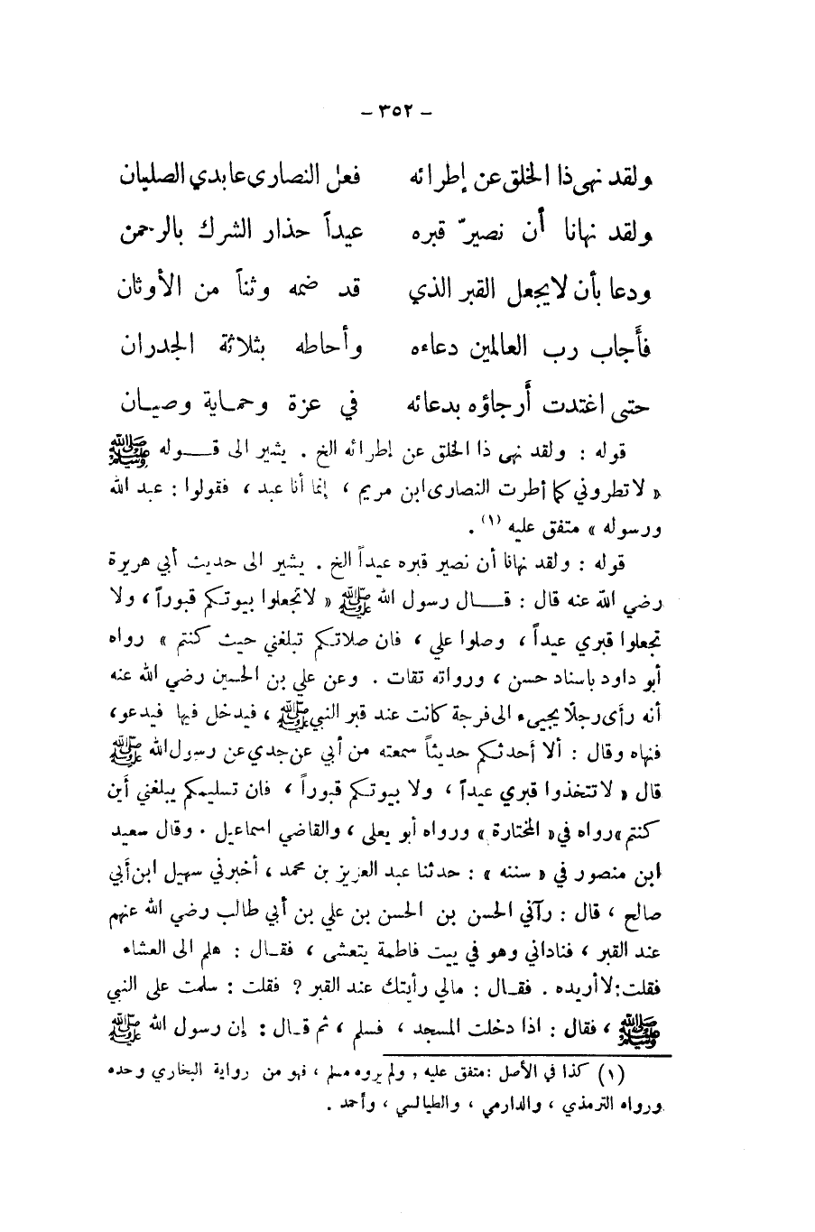قَوْله وَلَقَد نَهَانَا أَن نصير قَبره عيدا الخ يُشِير الى حَدِيث ابي هُرَيْرَة رَضِي الله عَنهُ قَالَ قَالَ رَسُول الله صلى الله عَلَيْهِ وَسلم لَا تجْعَلُوا بُيُوتكُمْ قبورا وَلَا تجْعَلُوا قَبْرِي عيدا وصلوا عَليّ فان صَلَاتكُمْ تبلغني حَيْثُ كُنْتُم رَوَاهُ أَبُو دَاوُد باسناد حسن وَرُوَاته ثِقَات وَعَن عَليّ بن الْحُسَيْن رَضِي الله عَنهُ أَنه رأى رجلا يَجِيء الى فُرْجَة كَانَت عِنْد قبر النَّبِي صلى الله عَلَيْهِ وَسلم فَيدْخل فِيهَا فيدعو فَنَهَاهُ وَقَالَ أَلا أحدثكُم حَدِيثا سمعته من ابي عَن جدي عَن رَسُول الله صلى الله عَلَيْهِ وَسلم قَالَ لَا تَتَّخِذُوا قَبْرِي عيدا وَلَا بُيُوتكُمْ قبورا فان تسليمكم يبلغنِي أَيْن كُنْتُم رَوَاهُ فِي المختارة وَرَوَاهُ ابو يعلى وَالْقَاضِي اسماعيل وَقَالَ سعيد ابْن مَنْصُور فِي سنَنه حَدثنَا عبد الْعَزِيز بن مُحَمَّد أَخْبرنِي سُهَيْل ابْن أبي صَالح قَالَ رَآنِي الْحسن بن الْحسن بن عَليّ بن ابي طَالب رَضِي الله عَنْهُم عِنْد الْقَبْر فناداني وَهُوَ فِي بَيت فَاطِمَة يتعشى فَقَالَ هَلُمَّ الى الْعشَاء فَقلت لَا أريده فَقَالَ مَا لي رَأَيْتُك عِنْد الْقَبْر فَقلت سلمت على النَّبِي صلى الله عَلَيْهِ وَسلم فَقَالَ اذا دخلت الْمَسْجِد فَسلم ثمَّ قَالَ إِن رَسُول صلى الله عَلَيْهِ وَسلم