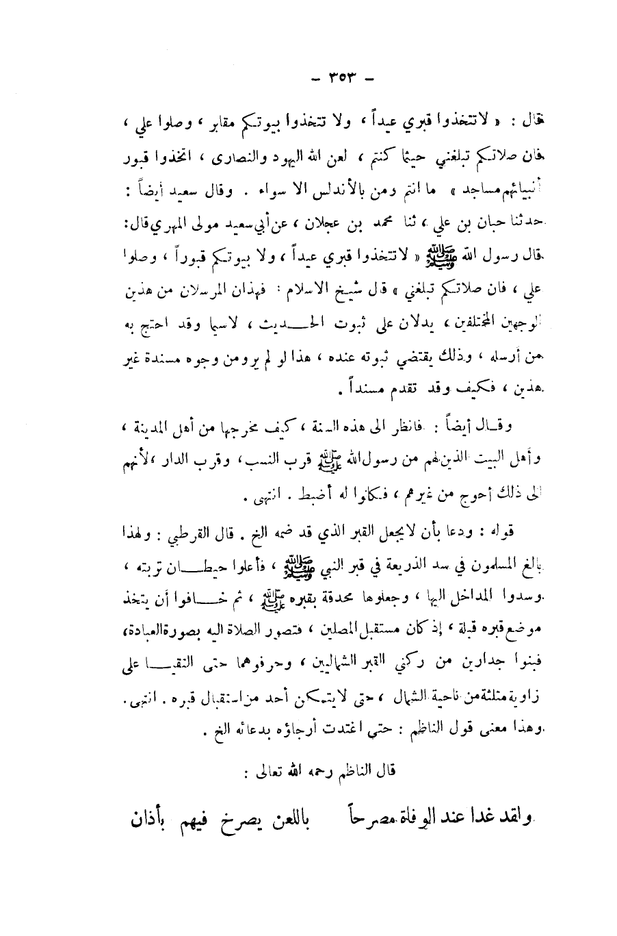 قَالَ لَا تَتَّخِذُوا قَبْرِي عيدا وَلَا تَتَّخِذُوا بُيُوتكُمْ مَقَابِر وصلوا عَليّ فان صَلَاتكُمْ تبلغني حَيْثُمَا كُنْتُم لعن الله الْيَهُود وَالنَّصَارَى اتَّخذُوا قُبُور أَنْبِيَائهمْ مَسَاجِد مَا انتم وَمن بالأندلس الا سَوَاء وَقَالَ سعيد ايضا حَدثنَا حبَان بن عَليّ ثَنَا مُحَمَّد بن عجلَان عَن أبي سعيد مولى الْمهرِي قَالَ قَالَ رَسُول الله صلى الله عَلَيْهِ وَسلم لَا تَتَّخِذُوا قَبْرِي عيدا وَلَا بُيُوتكُمْ قبورا وصلوا عَليّ فان صَلَاتكُمْ تبلغني قَالَ شيخ الاسلام فهذان المرسلان من هذَيْن الْوَجْهَيْنِ الْمُخْتَلِفين يدلان على ثُبُوت الحَدِيث لَا سِيمَا وَقد احْتج بِهِ من أرْسلهُ وَذَلِكَ يَقْتَضِي ثُبُوته عِنْده هَذَا لَو لم يرو من وُجُوه مُسندَة غير هذَيْن فَكيف وَقد تقدم مُسْندًا