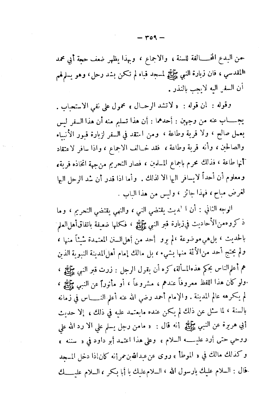 الْوَجْه الثَّانِي أَن الحَدِيث يَقْتَضِي النَّهْي وَالنَّهْي يَقْتَضِي التَّحْرِيم وَمَا ذَكرُوهُ من الْأَحَادِيث فِي زِيَارَة قبر النَّبِي صلى الله عَلَيْهِ وَسلم فَكلهَا ضَعِيفَة بِاتِّفَاق أهل الْعلم بِالْحَدِيثِ بل هِيَ مَوْضُوعَة لم يرو أحد من أهل السّنَن الْمُعْتَمدَة شَيْئا مِنْهَا وَلم يحْتَج اُحْدُ من الائمة مِنْهَا بِشَيْء بل مَالك إِمَام أهل الْمَدِينَة النَّبَوِيَّة الَّذين هم أعلم النَّاس بِحكم هَذِه الْمَسْأَلَة كره أَن يَقُول الرجل زرت قبر النَّبِي صلى الله عَلَيْهِ وَسلم وَلَو كَانَ هَذَا اللَّفْظ مَعْرُوفا عِنْدهم مَشْرُوعا أَو مأثورا عَن النَّبِي صلى الله عَلَيْهِ وَسلم لم يكرههُ عَالم الْمَدِينَة وَالْإِمَام احْمَد رَضِي الله عَنهُ أعلم النَّاس فِي زَمَانه بِالسنةِ لما سُئِلَ عَن ذَلِك لم يكن عِنْده مَا يعْتَمد عَلَيْهِ فِي ذَلِك إِلَّا حَدِيث أبي هُرَيْرَة عَن النَّبِي صلى الله عَلَيْهِ وَسلم أَنه قَالَ مَا من رجل يسلم عَليّ إِلَّا رد الله عَليّ روحي حَتَّى أرد عَلَيْهِ السَّلَام وعَلى هَذَا اعْتمد أَبُو دَاوُد فِي سنَنه وَكَذَلِكَ مَالك فِي الْمُوَطَّأ روى عَن عبد الله بن عمر أَنه كَانَ إِذا دخل الْمَسْجِد قَالَ السَّلَام عَلَيْك يَا رَسُول الله السَّلَام عَلَيْك يَا أَبَا بكر السَّلَام عَلَيْك
