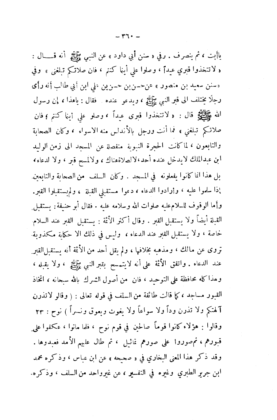يَا أَبَت ثمَّ ينْصَرف وَفِي سنَن أبي دَاوُد عَن النَّبِي صلى الله عَلَيْهِ وَسلم أَنه قَالَ لَا تَتَّخِذُوا قَبْرِي عيدا وصلوا عَليّ أَيْنَمَا كُنْتُم فان صَلَاتكُمْ تبلغني وَفِي سنَن سعيد بن مَنْصُور عَن حسن بن حسن بن عَليّ ابْن أبي طَالب أَنه رأى رجلا يخْتَلف الى قبر النَّبِي صلى الله عَلَيْهِ وَسلم وَيَدْعُو عِنْده فَقَالَ يَا هَذَا إِن رَسُول الله صلى الله عَلَيْهِ وَسلم قَالَ لَا تَتَّخِذُوا قَبْرِي عيدا وصلوا عَليّ أَيْنَمَا كُنْتُم فان صَلَاتكُمْ تبلغني فَمَا أَنْت وَرجل بالأندلس مِنْهُ الا سَوَاء وَكَانَ الصَّحَابَة والتابعون لما كَانَت الْحُجْرَة النَّبَوِيَّة مُنْفَصِلَة عَن الْمَسْجِد الى زمن الْوَلِيد ابْن عبد الْملك لَا يدْخل عِنْده اُحْدُ لَا لصَلَاة هُنَاكَ وَلَا لمسح قبر وَلَا لدعاء بل هَذَا انما كَانُوا يَفْعَلُونَهُ فِي الْمَسْجِد وَكَانَ السّلف من الصَّحَابَة وَالتَّابِعِينَ إِذا سلمُوا عَلَيْهِ وَأَرَادُوا الدُّعَاء دعوا مستقبلي الْقبْلَة وَلم يستقبلوا الْقَبْر وَأما الْوُقُوف للسلام عَلَيْهِ صلوَات الله وَسَلَامه عَلَيْهِ فَقَالَ أَبُو حنيفَة يسْتَقْبل الْقبْلَة ايضا وَلَا يسْتَقْبل الْقَبْر وَقَالَ أَكثر الْأَئِمَّة يسْتَقْبل الْقَبْر عِنْد السَّلَام خَاصَّة وَلَا يسْتَقْبل الْقَبْر عِنْد الدُّعَاء وَلَيْسَ فِي ذَلِك إِلَّا حِكَايَة مكذوبة تروى عَن مَالك ومذهبه بِخِلَافِهَا وَلم يقل أحد من الْأَئِمَّة أَنه يسْتَقْبل الْقَبْر عِنْد الدُّعَاء وَاتفقَ الائمة على أَنه لَا يتمسح بِقَبْر النَّبِي صلى الله عَلَيْهِ وَسلم وَلَا يقبله وَهَذَا كُله مُحَافظَة على التَّوْحِيد فان من أصُول الشّرك بِاللَّه سُبْحَانَهُ اتِّخَاذ الْقُبُور مَسَاجِد كَمَا قَالَت طَائِفَة من السّلف فِي قَوْله تَعَالَى {وَقَالُوا لَا تذرن آلِهَتكُم وَلَا تذرن ودا وَلَا سواعا وَلَا يَغُوث ويعوق ونسرا} نوح وَقَالُوا هَؤُلَاءِ كَانُوا قوما صالحين فِي قوم نوح فَلَمَّا مَاتُوا عكفوا على قُبُورهم ثمَّ صوروا على صورهم تماثيل ثمَّ طَال عَلَيْهِم الأمد فعبدوها وَقد ذكر هَذَا الْمَعْنى البُخَارِيّ فِي صَحِيحه عَن ابْن عَبَّاس وَذكره مُحَمَّد ابْن جرير الطَّبَرِيّ وَغَيره فِي التَّفْسِير عَن غير وَاحِد من السّلف وَذكره