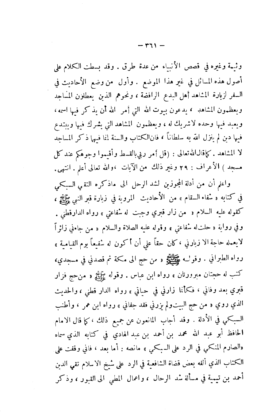 وَاعْلَم ان من أَدِلَّة المجوزين لشد الرحل الى مَا ذكره التقي السُّبْكِيّ فِي كِتَابه شِفَاء السقام من الْأَحَادِيث المروية فِي زِيَارَة قبر النَّبِي صلى الله عَلَيْهِ وَسلم كَقَوْلِه عَلَيْهِ السَّلَام من زار قَبْرِي وَجَبت لَهُ شَفَاعَتِي رَوَاهُ الدَّارَقُطْنِيّ وَفِي رِوَايَة حلت لَهُ شَفَاعَتِي وَقَوله عَلَيْهِ الصَّلَاة وَالسَّلَام من جَاءَنِي زَائِرًا لَا يعمله حَاجَة الا زيارتي كَانَ حَقًا عَليّ ان أكون لَهُ شَفِيعًا يَوْم الْقِيَامَة رَوَاهُ الطَّبَرَانِيّ وَقَوله صلى الله عَلَيْهِ وَسلم من حج الى مَكَّة ثمَّ قصدني فِي مَسْجِدي كتب لَهُ حجتان مبرورتان رَوَاهُ ابْن عَبَّاس وَقَوله صلى الله عَلَيْهِ وَسلم من حج فزار قَبْرِي بعد وفاتي فَكَأَنَّمَا زارني فِي حَياتِي رَوَاهُ الدَّارَقُطْنِيّ والْحَدِيث الَّذِي رُوِيَ من حج الْبَيْت وَلم يزرني فقد جفاني رَوَاهُ ابْن عمر وَأَطْنَبَ السُّبْكِيّ فِي الْأَدِلَّة وَقد أجَاب المانعون عَن جَمِيع ذَلِك كَمَا قَالَ الامام الْحَافِظ أَبُو عبد الله مُحَمَّد بن احْمَد بن عبد الْهَادِي فِي كِتَابه الَّذِي سَمَّاهُ الصارم المنكي فِي الرَّد على السُّبْكِيّ مَا نَصه أما بعد فَانِي وقفت على الْكتاب الَّذِي أَلفه بعض قَضَاهُ الشَّافِعِيَّة فِي الرَّد على شيخ الاسلام تَقِيّ الدّين احْمَد بن تَيْمِية فِي مَسْأَلَة شدّ الرّحال واعمال الْمطِي الى الْقُبُور وَذكر