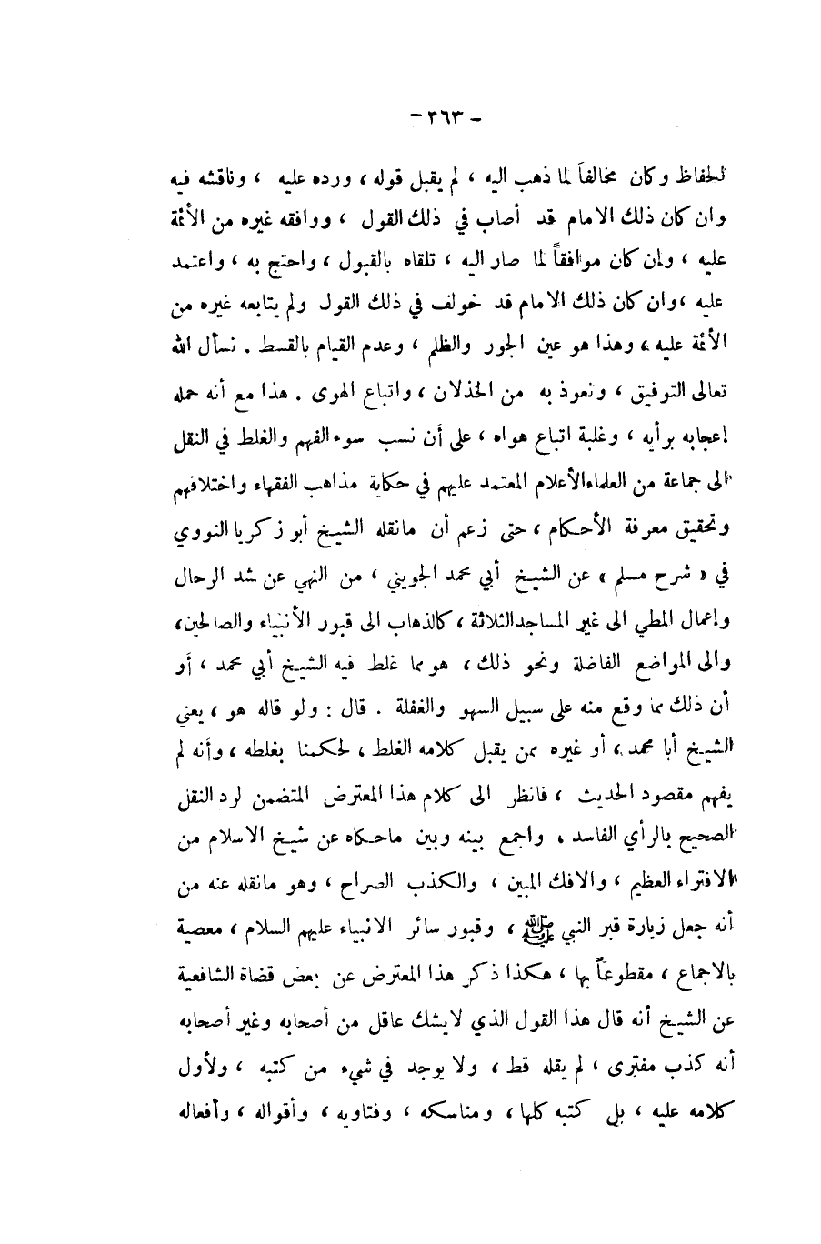 الْحفاظ وَكَانَ مُخَالفا لما ذهب اليه لم يقبل قَوْله ورده عَلَيْهِ وناقشه فِيهِ وان كَانَ ذَلِك الامام قد أصَاب فِي ذَلِك القَوْل وَوَافَقَهُ غَيره من الْأَئِمَّة عَلَيْهِ وَإِن كَانَ مُوَافقا لما صَار اليه تَلقاهُ بِالْقبُولِ وَاحْتج بِهِ وَاعْتمد عَلَيْهِ وان كَانَ ذَلِك الامام قد خُولِفَ فِي ذَلِك القَوْل وَلم يُتَابِعه غَيره من الْأَئِمَّة عَلَيْهِ وَهَذَا هُوَ عين الْجور وَالظُّلم وَعدم الْقيام بِالْقِسْطِ نسْأَل الله تَعَالَى التَّوْفِيق ونعوذ بِهِ من الخذلان وَاتِّبَاع الْهوى هَذَا مَعَ أَنه حمله إعجابه بِرَأْيهِ وَغَلَبَة اتِّبَاع هَوَاهُ على أَن نسب سوء الْفَهم والغلط فِي النَّقْل الى جمَاعَة من الْعلمَاء الْأَعْلَام الْمُعْتَمد عَلَيْهِم فِي حِكَايَة مَذَاهِب الْفُقَهَاء وَاخْتِلَافهمْ وَتَحْقِيق معرفَة الْأَحْكَام حَتَّى زعم أَن مَا نَقله الشَّيْخ أَبُو زَكَرِيَّا النَّوَوِيّ فِي شرح مُسلم عَن الشَّيْخ أبي مُحَمَّد الْجُوَيْنِيّ من النَّهْي عَن شدّ الرّحال وإعمال الْمطِي الى غير الْمَسَاجِد الثَّلَاثَة كالذهاب الى قُبُور الْأَنْبِيَاء وَالصَّالِحِينَ والى الْمَوَاضِع الفاضلة وَنَحْو ذَلِك هُوَ مِمَّا غلط فِيهِ الشَّيْخ أبي مُحَمَّد اَوْ ان ذَلِك مِمَّا وَقع مِنْهُ على سَبِيل السَّهْو والغفلة قَالَ وَلَو قَالَه هُوَ يَعْنِي الشَّيْخ ابا مُحَمَّد أَو غَيره مِمَّن يقبل كَلَامه الْغَلَط لحكمنا بغلطه وَأَنه لم يفهم مَقْصُود الحَدِيث فَانْظُر الى كَلَام هَذَا الْمُعْتَرض المتضمن لرد النَّقْل الصَّحِيح بِالرَّأْيِ الْفَاسِد واجمع بَينه وَبَين مَا حَكَاهُ عَن شيخ الاسلام من الافتراء الْعَظِيم والافك الْمُبين وَالْكذب الصراح وَهُوَ مَا نَقله عَنهُ من أَنه جعل زِيَارَة قبر النَّبِي صلى الله عَلَيْهِ وَسلم وقبور سَائِر الانبياء عَلَيْهِم السَّلَام مَعْصِيّة بالاجماع مَقْطُوعًا بهَا هَكَذَا ذكر هَذَا الْمُعْتَرض عَن بعض قُضَاة الشَّافِعِيَّة عَن الشَّيْخ أَنه قَالَ هَذَا القَوْل الَّذِي لَا يشك عَاقل من أَصْحَابه وَغير أَصْحَابه أَنه كذب مفترى لم يقلهُ قطّ وَلَا يُوجد فِي شَيْء من كتبه ولأول كَلَامه عَلَيْهِ بل كتبه كلهَا ومناسكه وفتاويه وأقواله وأفعاله