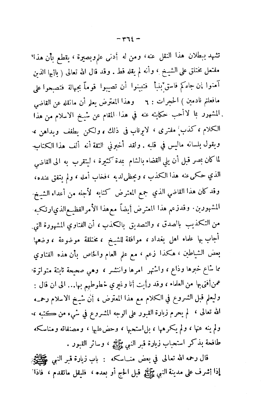 تشهد بِبُطْلَان هَذَا النَّقْل عَنهُ وَمن لَهُ أدنى علم وبصيرة يقطع بِأَن هَذَا مفتعل مختلق على الشَّيْخ وَأَنه لم يقلهُ قطّ وَقد قَالَ الله تَعَالَى {يَا أَيهَا الَّذين آمنُوا إِن جَاءَكُم فَاسق بِنَبَأٍ فَتَبَيَّنُوا أَن تصيبوا قوما بِجَهَالَة فتصبحوا على مَا فَعلْتُمْ نادمين} الحجرات وَهَذَا الْمُعْتَرض يعلم أَن مَا نَقله عَن القَاضِي الْمَشْهُور بِمَا لَا أحب حكايته عَنهُ فِي هَذَا الْمقَام عَن شيخ الاسلام من هَذَا الْكَلَام كذب مفترى لَا يرتاب فِي ذَلِك وَلَكِن يطفف ويداهن وَيَقُول بِلِسَانِهِ مَا لَيْسَ فِي قلبه وَلَقَد أَخْبرنِي الثِّقَة أَنه ألف هَذَا الْكتاب لما كَانَ بِمصْر قبل أَن يَلِي الْقَضَاء بِالشَّام بِمدَّة كَثِيرَة ليتقرب بِهِ الى القَاضِي الَّذِي حكى عَنهُ هَذَا الْكَذِب ويحظى لَدَيْهِ فخاب امله وَلم يتَّفق عِنْده وَقد كَانَ هَذَا القَاضِي الَّذِي جمع الْمُعْتَرض كِتَابه لأَجله من أَعدَاء الشَّيْخ الْمَشْهُورين وَقد زعم هَذَا الْمُعْتَرض أَيْضا مَعَ هَذَا الْأَمر الفظيع الَّذِي ارْتَكَبهُ من التَّكْذِيب بِالصّدقِ والتصديق بِالْكَذِبِ أَن الفتاوي الْمَشْهُورَة الَّتِي أجَاب بهَا عُلَمَاء اهل بَغْدَاد مُوَافقَة للشَّيْخ مختلقة مَوْضُوعَة وَضعهَا بعض الشَّيَاطِين هَكَذَا زعم مَعَ علم الْعَام وَالْخَاص بِأَن هَذِه الفتاوي مِمَّا شاع خَبَرهَا وذاع واشتهر امرها وانتشر وَهِي صَحِيحَة ثَابِتَة متواترة عَمَّن افتى بهَا من الْعلمَاء وَقد رَأَيْت أَنا وغيري خطوطهم بهَا الى ان قَالَ وليعلم قبل الشُّرُوع فِي الْكَلَام مَعَ هَذَا الْمُعْتَرض أَن شيخ الاسلام رَحمَه الله تَعَالَى لم يحرم زِيَارَة الْقُبُور على الْوَجْه الْمَشْرُوع فِي شئ من كتبه وَلم ينْه عَنْهَا وَلم يكرهها بل استحبها وحض عَلَيْهَا ومصنفاته ومناسكه طافحة بِذكر اسْتِحْبَاب زِيَارَة قبر النَّبِي صلى الله عَلَيْهِ وَسلم وَسَائِر الْقُبُور