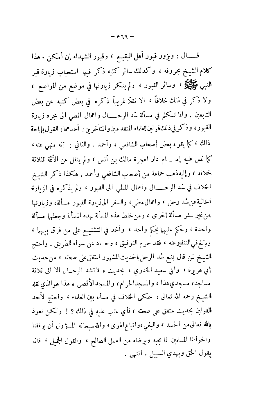 قَالَ ويزور قُبُور اهل البقيع وقبور الشُّهَدَاء إِن أمكن هَذَا كَلَام الشَّيْخ بِحُرُوفِهِ وَكَذَلِكَ سَائِر كتبه ذكر فِيهَا اسْتِحْبَاب زِيَارَة قبر النَّبِي صلى الله عَلَيْهِ وَسلم وَسَائِر الْقُبُور وَلم يُنكر زيارتها فِي مَوضِع من الْمَوَاضِع وَلَا ذكر فِي ذَلِك خلافًا الا نقلا غَرِيبا ذكره فِي بعض كتبه عَن بعض التَّابِعين وانما تكلم فِي مَسْأَلَة شدّ الرّحال وأعمال الْمطِي الى مُجَرّد زِيَارَة الْقُبُور وَذكر فِي ذَلِك قَوْلَيْنِ للْعُلَمَاء الْمُتَقَدِّمين والمتأخرين أَحدهمَا القَوْل بِإِبَاحَة ذَلِك كَمَا يَقُوله بعض أَصْحَاب الشَّافِعِي وَاحْمَدْ وَالثَّانِي أَنه مَنْهِيّ عَنهُ كَمَا نَص عَلَيْهِ إِمَام دَار الْهِجْرَة مَالك بن أنس وَلم ينْقل عَن الْأَئِمَّة الثَّلَاثَة خِلَافه وَإِلَيْهِ ذهب جمَاعَة من أَصْحَاب الشَّافِعِي وَاحْمَدْ هَكَذَا ذكر الشَّيْخ الْخلاف فِي شدّ الرّحال واعمال الْمطِي الى الْقُبُور وَلم يذكرهُ فِي الزِّيَارَة الخالية عَن شدّ رَحل واعمال مطي وَالسّفر الى زِيَارَة الْقُبُور مَسْأَلَة وزيارتها من غير سفر مَسْأَلَة أُخْرَى وَمن خلط هَذِه الْمَسْأَلَة بِهَذِهِ الْمَسْأَلَة وجعلهما مَسْأَلَة وَاحِدَة وَحكم عَلَيْهِمَا بِحكم وَاحِد وَأخذ فِي التشنيع على من فرق بَينهمَا وَبَالغ فِي التنفير عَنهُ فقد حرم التَّوْفِيق وحاد عَن سَوَاء الطَّرِيق وَاحْتج الشَّيْخ لمن قَالَ بِمَنْع شدّ الرحل بِالْحَدِيثِ الْمَشْهُور الْمُتَّفق على صِحَّته من حَدِيث ابي هُرَيْرَة وابي سعيد الْخُدْرِيّ بِحَدِيث لَا تشد الرّحال إِلَّا إِلَى ثَلَاثَة مَسَاجِد مَسْجِدي هَذَا وَالْمَسْجِد الْحَرَام وَالْمَسْجِد الْأَقْصَى هَذَا هُوَ الَّذِي نَقله الشَّيْخ رَحمَه الله تَعَالَى حكى الْخلاف فِي مَسْأَلَة بَين الْعلمَاء وَاحْتج لأحد الْقَوْلَيْنِ بِحَدِيث مُتَّفق على صِحَّته فَأَي عتب عَلَيْهِ فِي ذَلِك وَلَكِن نَعُوذ بِاللَّه تَعَالَى من الْحَسَد وَالْبَغي وَاتِّبَاع الْهوى وَالله سُبْحَانَهُ المسؤول ان يوفقنا واخواننا الْمُسلمين لما يُحِبهُ ويرضاه من الْعَمَل الصَّالح وَالْقَوْل الْجَمِيل فانه يَقُول الْحق وَيهْدِي السَّبِيل انْتهى