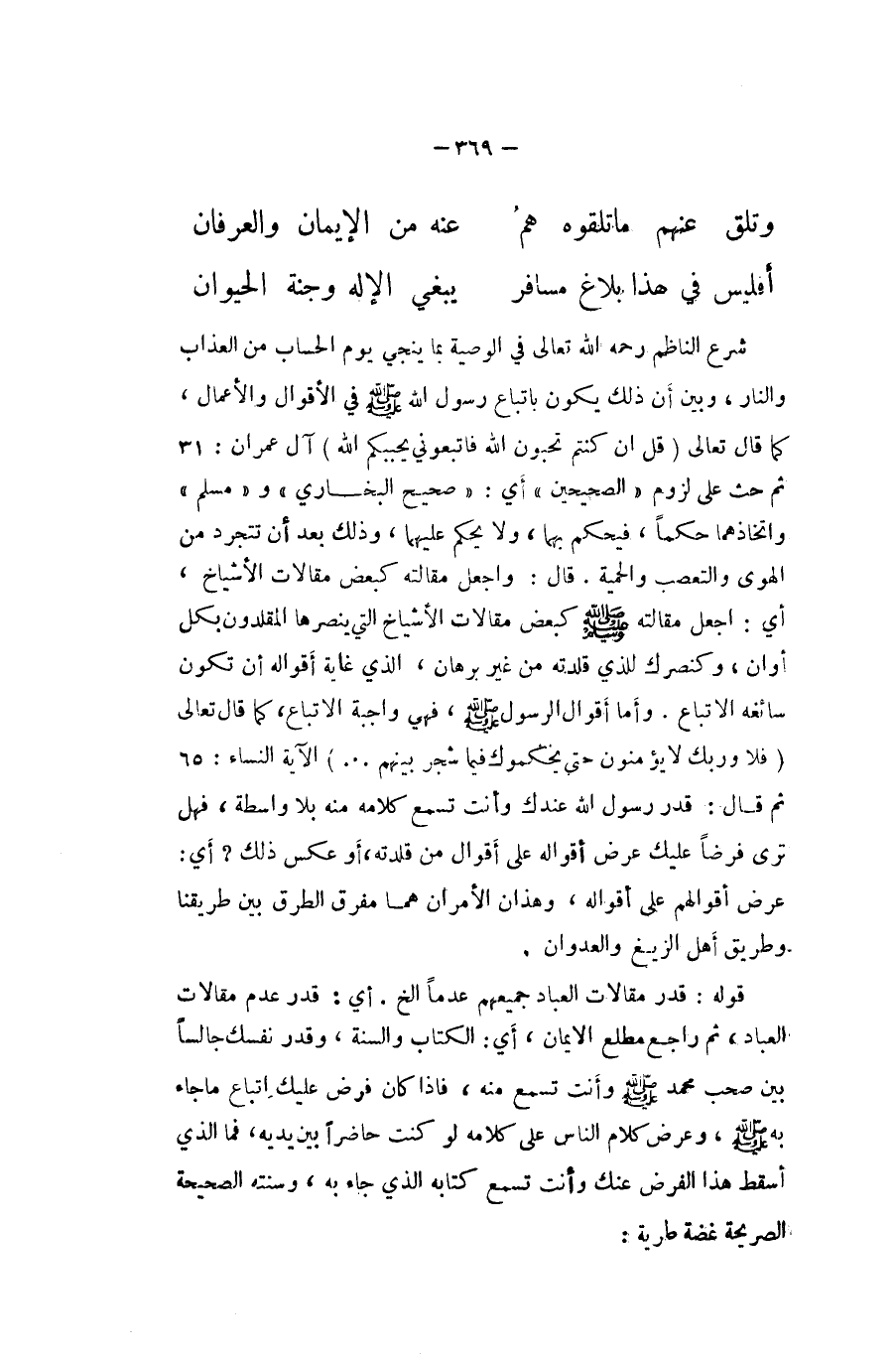 شرع النَّاظِم رَحمَه الله تَعَالَى فِي الْوَصِيَّة بِمَا يُنجي يَوْم الْحساب من الْعَذَاب وَالنَّار وَبَين أَن يكون بِاتِّبَاع رَسُول الله صلى الله عَلَيْهِ وَسلم فِي الْأَقْوَال والأعمال كَمَا قَالَ تَعَالَى {قل إِن كُنْتُم تحبون الله فَاتبعُوني يحببكم الله} آل عمرَان ثمَّ حث على لُزُوم الصَّحِيحَيْنِ أَي صَحِيح البُخَارِيّ وَمُسلم واتخاذهما حكما فَيحكم بهما وَلَا يحكم عَلَيْهِمَا وَذَلِكَ بعد أَن تتجرد من الْهوى والتعصب وَالْحمية قَالَ وَاجعَل مقَالَته كبعض مقالات الْأَشْيَاخ أَي اجْعَل مقَالَته صلى الله عَلَيْهِ وَسلم كبعض مقالات الْأَشْيَاخ الَّتِي ينصرها المقلدون بِكُل أَوَان وكنصرك للَّذي قلدته من غير برهَان الَّذِي غَايَة أَقْوَاله أَن تكون سَائِغَة الِاتِّبَاع وَأما أَقْوَال الرَّسُول صلى الله عَلَيْهِ وَسلم فَهِيَ وَاجِبَة الِاتِّبَاع كَمَا قَالَ تَعَالَى {فَلَا وَرَبك لَا يُؤمنُونَ حَتَّى يُحَكِّمُوك فِيمَا شجر بَينهم} الْآيَة النِّسَاء ثمَّ قَالَ قدر رَسُول الله عنْدك وَأَنت تسمع كَلَامه مِنْهُ بِلَا وَاسِطَة فَهَل ترى فرضا عَلَيْك عرض أَقْوَاله على اقوال من قلدته أَو عكس ذَلِك أَي عرض أَقْوَالهم على أَقْوَاله وَهَذَانِ الامران هما مفرق الطّرق بَين طريقنا وَطَرِيق أهل الزيغ والعدوان