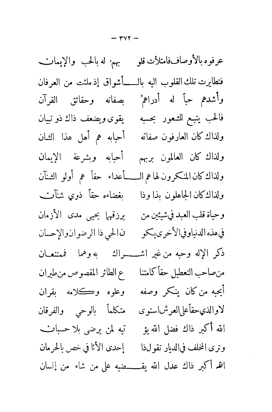 .. عرفوه بالأوصاف فامتلأت قلو ... بهم لَهُ بالحب وَالْإِيمَان ... فَتَطَايَرَتْ تِلْكَ الْقُلُوب اليه بَال أشواق إِذْ ملئت من الْعرْفَان