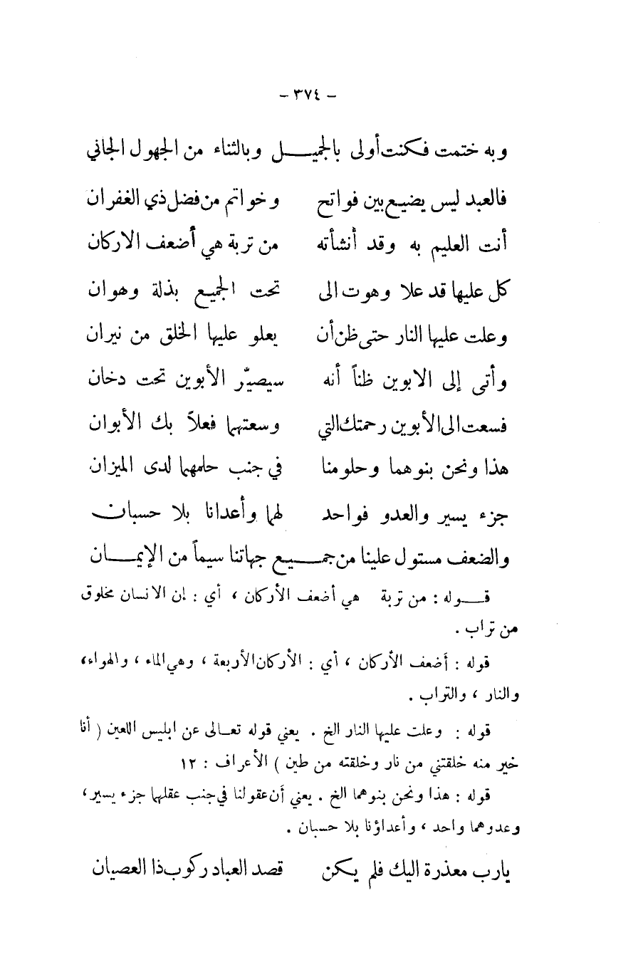 أَنْت الْعَلِيم بِهِ وَقد أنشأته من تربة هِيَ أَضْعَف الاركان ... كل عَلَيْهَا قد علا وهوت الى ... تَحت الْجَمِيع بذلة وهوان ... وعلت عَلَيْهَا النَّار حَتَّى ظن أَن ... يَعْلُو عَلَيْهَا الْخلق من نيران