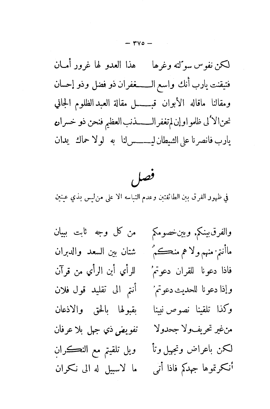 فِي ظُهُور الْفرق بَين الطَّائِفَتَيْنِ وَعدم التباسه الا على من لَيْسَ بِذِي عينين ... وَالْفرق بَيْنكُم وَبَين خصومكم ... من كل وَجه ثَابت بِبَيَان