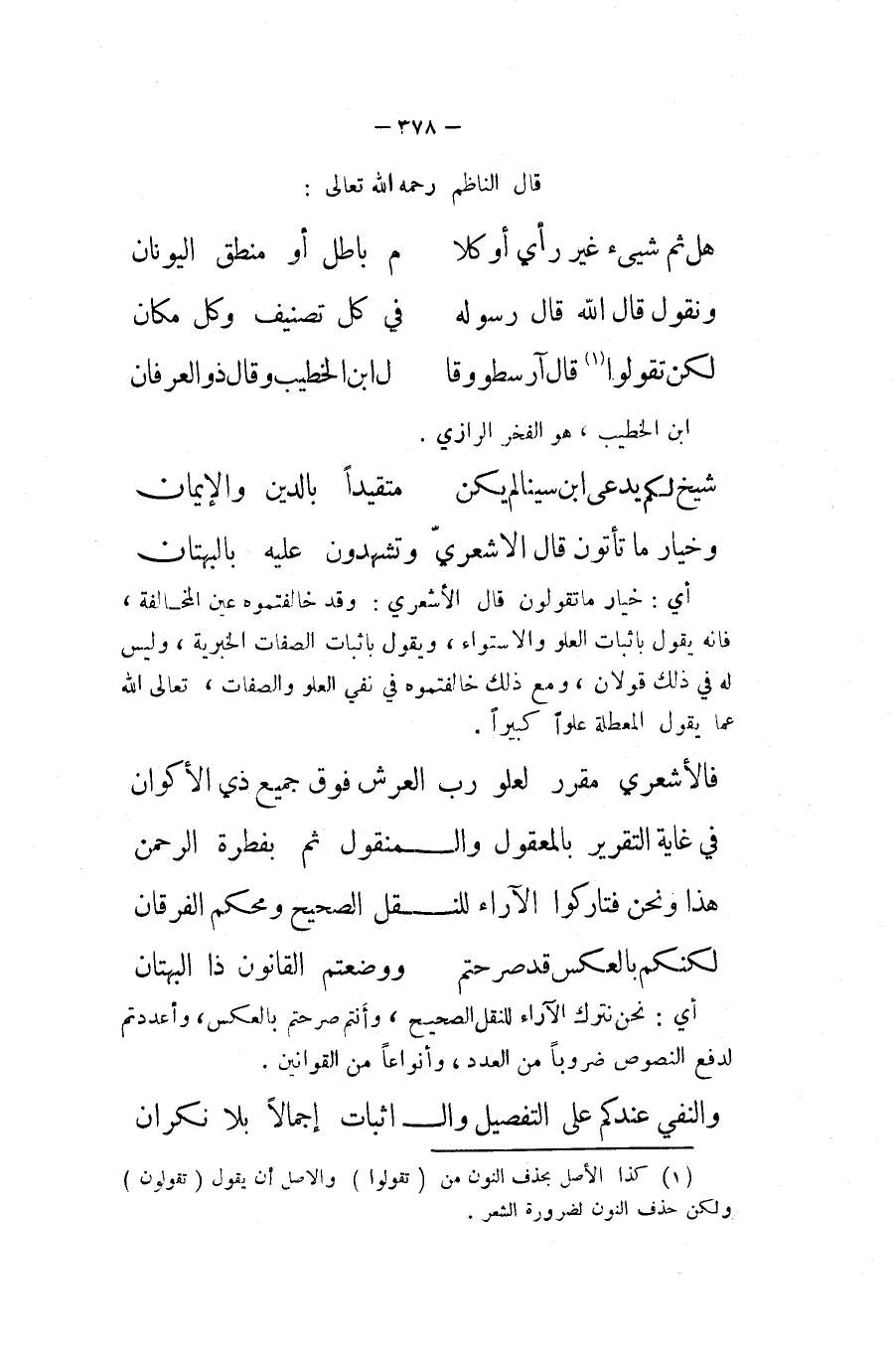 قَالَ النَّاظِم رَحمَه الله تَعَالَى هَل ثمَّ شَيْء غير رَأْي أَو كَلَام بَاطِل أَو منطق اليونان ونقول قَالَ الله قَالَ وَرَسُوله فِي كل تصنيف وكل مَكَان لَكِن تَقولُوا قَالَ آرسطو وَقَالَ ابْن الْخَطِيب وَقَالَ ذُو الْعرْفَان ابْن الْخَطِيب هُوَ الْفَخر الرَّازِيّ شيخ لكم يدعى ابْن سينا لم يكن متقيدا بِالدّينِ وَالْإِيمَان وَخيَار مَا تأتون قَالَ الْأَشْعَرِيّ وتشهدون عَلَيْهِ بالبتهان أَي خِيَار مَا تَقولُونَ قَالَ الْأَشْعَرِيّ وَقد خالفتموه عين الْمُخَالفَة فَإِنَّهُ يَقُول بِإِثْبَات الْعُلُوّ والاستواء وَيَقُول بِإِثْبَات الصِّفَات الخبرية وَلَيْسَ لَهُ فِي ذَلِك قَولَانِ وَمَعَ ذَلِك خالفتموه فِي نفي الْعُلُوّ وَالصِّفَات تَعَالَى الله عَمَّا يَقُول المعطلة علوا كَبِيرا فالأشعري مُقَرر لعلو رب الْعَرْش فَوق جَمِيع ذِي الأكوان فِي غَايَة التَّقْرِير بالمعقول وَالْمَنْقُول ثمَّ بفطرة الرَّحْمَن هَذَا وَنحن فتاركوا الآراء للنَّقْل الصَّحِيح ومحكم الْفرْقَان لكنكم بِالْعَكْسِ قد صرحتم ووضعتم القانون ذَا الْبُهْتَان أَي نَحن نَتْرُك الآراء للنَّقْل الصَّحِيح وَأَنْتُم صرحتم بِالْعَكْسِ وأعددتم لدفع النُّصُوص ضروبا من الْعدَد وأنواعا من القوانين وَالنَّفْي عنْدكُمْ على التَّفْصِيل والاثبات إمالا بِلَا نكران