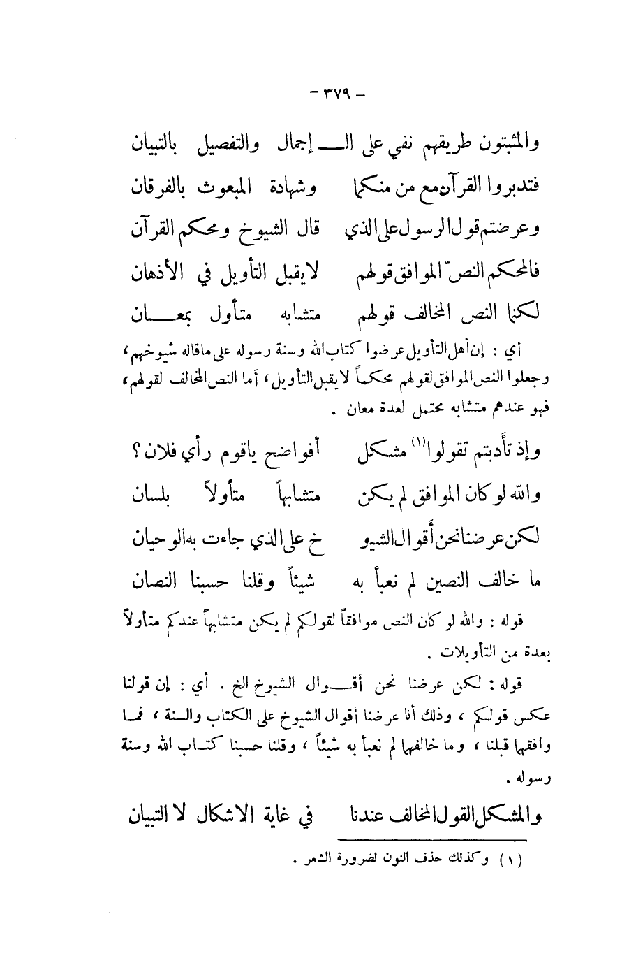 والمثبتون طريقهم نفي على الْإِجْمَال وَالتَّفْصِيل بالتبيان فتدبروا الْقُرْآن مَعَ من مِنْكُمَا وَشَهَادَة الْمَبْعُوث بالفرقان وعرضتم قَول الرَّسُول على الَّذِي قَالَ الشُّيُوخ فالمحكم النَّص الْمُوَافق قَوْلهم لَا يقبل التَّأْوِيل فِي الأذهان لكنما النَّص الْمُخَالف قَوْلهم متشابه متأول بمعان أَي إِن أهل التَّأْوِيل عرضوا كتاب الله وَسنة رَسُوله على مَا قَالَه شيوخهم وَجعلُوا النَّص الْمُوَافق لقَولهم محكما لَا يقبل التَّأْوِيل أما النَّص الْمُخَالف لقَولهم فَهُوَ عِنْدهم متاشبه مُحْتَمل لعدة معَان ... وَإِذ تأدبتم تَقولُوا مُشكل أفواضح يَا قوم رَأْي فلَان ... وَالله لَو كَانَ الْمُوَافق لم يكن ... متشابها متأولا بِلِسَان ... لَكِن عرضنَا نَحن أَقْوَال الشُّيُوخ ... على الَّذِي جَاءَت بِهِ الوحيان مَا خلف النصين لم نعبأ بِهِ ... شَيْئا وَقُلْنَا وحسبنا النصان ...