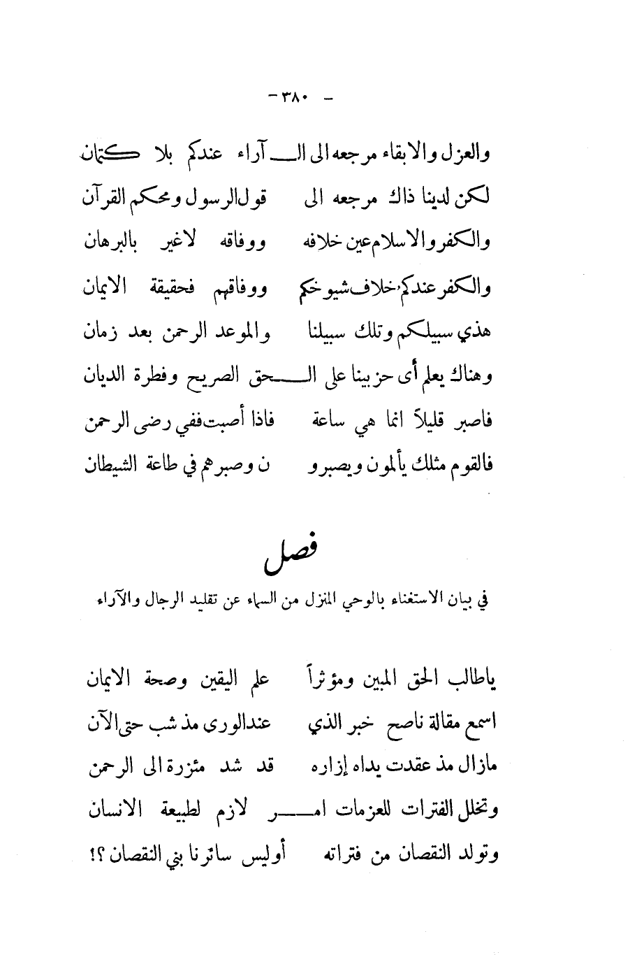 فصل فِي بَيَان الِاسْتِغْنَاء بِالْوَحْي الْمنزل من السَّمَاء عَن تَقْلِيد الرِّجَال والآراء ... يَا طَالب الْحق الْمُبين ومؤثرا ... علم الْيَقِين وَصِحَّة الايمان