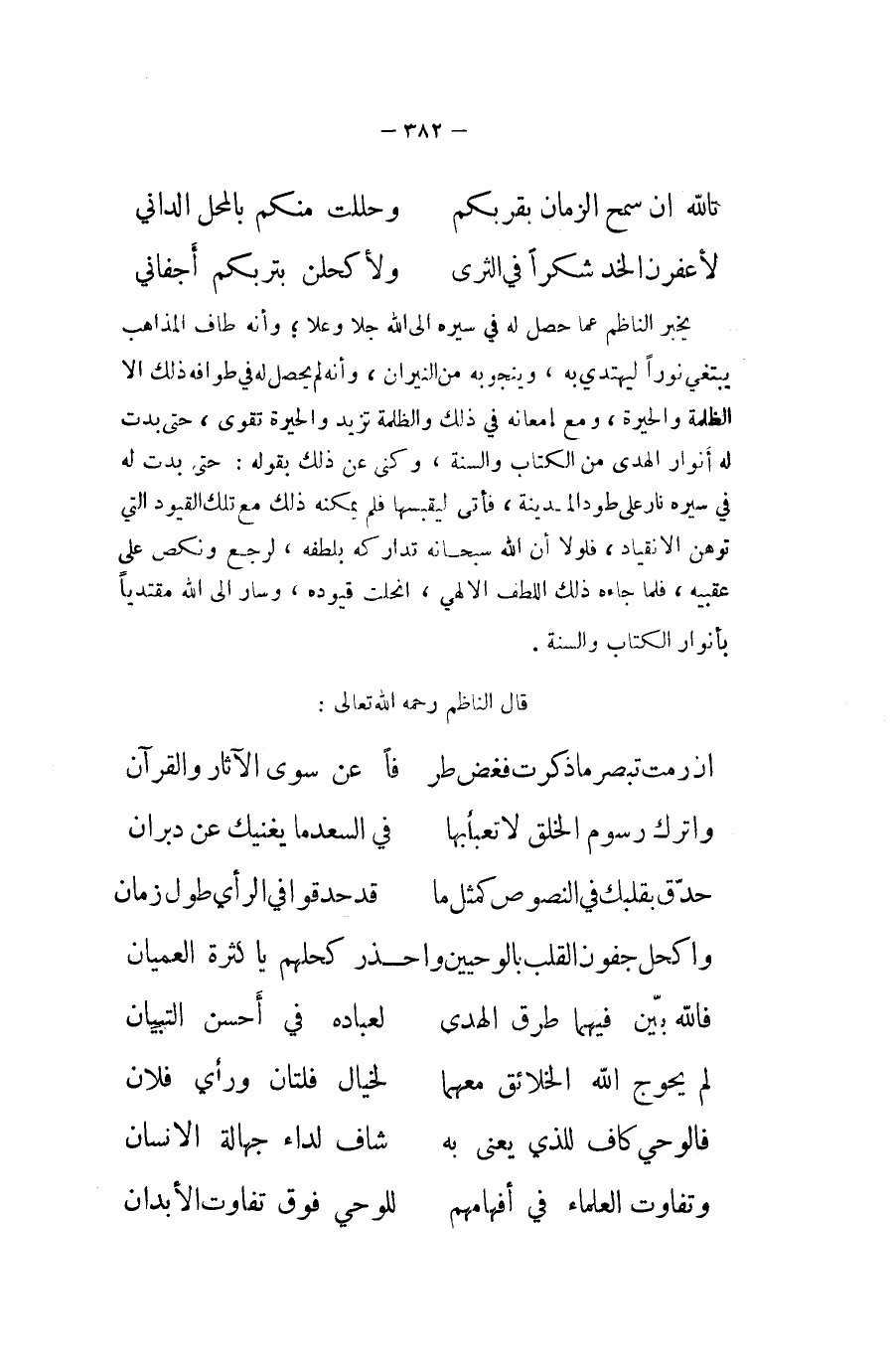 يخبر النَّاظِم عَمَّا حصل لَهُ فِي سيره الى الله جلا وَعلا وَأَنه طَاف الْمذَاهب يَبْتَغِي نورا ليهتدي بِهِ وينجو بِهِ من النيرَان وَأَنه لم يحصل لَهُ فِي طَوَافه ذَلِك الا الظلمَة والحيرة وَمَعَ إمعانه فِي ذَلِك والظلمة تزيد والحيرة تقوى حَتَّى بَدَت لَهُ انوار الْهدى من الْكتاب وَالسّنة وكنى عَن ذَلِك بقوله حَتَّى بَدَت لَهُ فِي سيره نَار على طود الْمَدِينَة فَأتى ليقبسها فَلم يُمكنهُ ذَلِك مَعَ تِلْكَ الْقُيُود الَّتِي توهن الانقياد فلولا أَن الله سُبْحَانَهُ تَدَارُكه بِلُطْفِهِ لرجع ونكص على عَقِبَيْهِ فَلَمَّا جَاءَهُ ذَلِك اللطف الالهي انْحَلَّت قيوده وَسَار الى الله مقتديا بأنوار الْكتاب وَالسّنة قَالَ النَّاظِم رَحمَه الله تَعَالَى ... ان رمت تبصر مَا ذكرت فغض طر ... فا عَن سوى الْآثَار وَالْقُرْآن