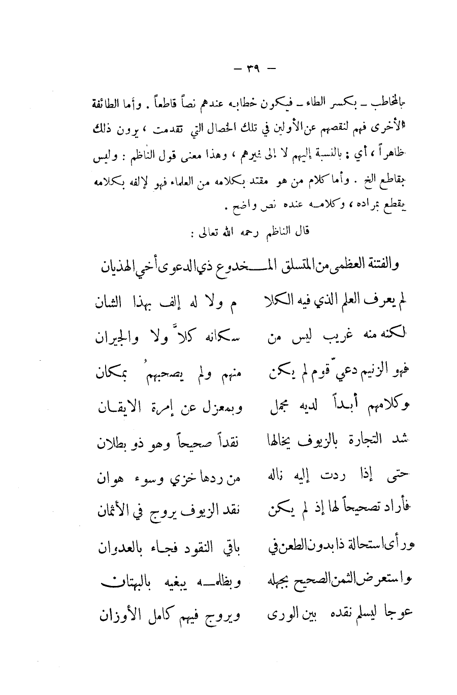... والفتنة الْعُظْمَى من المتسلق المخدوع ذِي الدَّعْوَى أخي الهذيان ... لم يعرف الْعلم الَّذِي فِيهِ الكلا ... م وَلَا لَهُ إلْف بِهَذَا الشان ... لكنه مِنْهُ غَرِيب لَيْسَ من ... سكانه كلا وَلَا وَالْجِيرَان