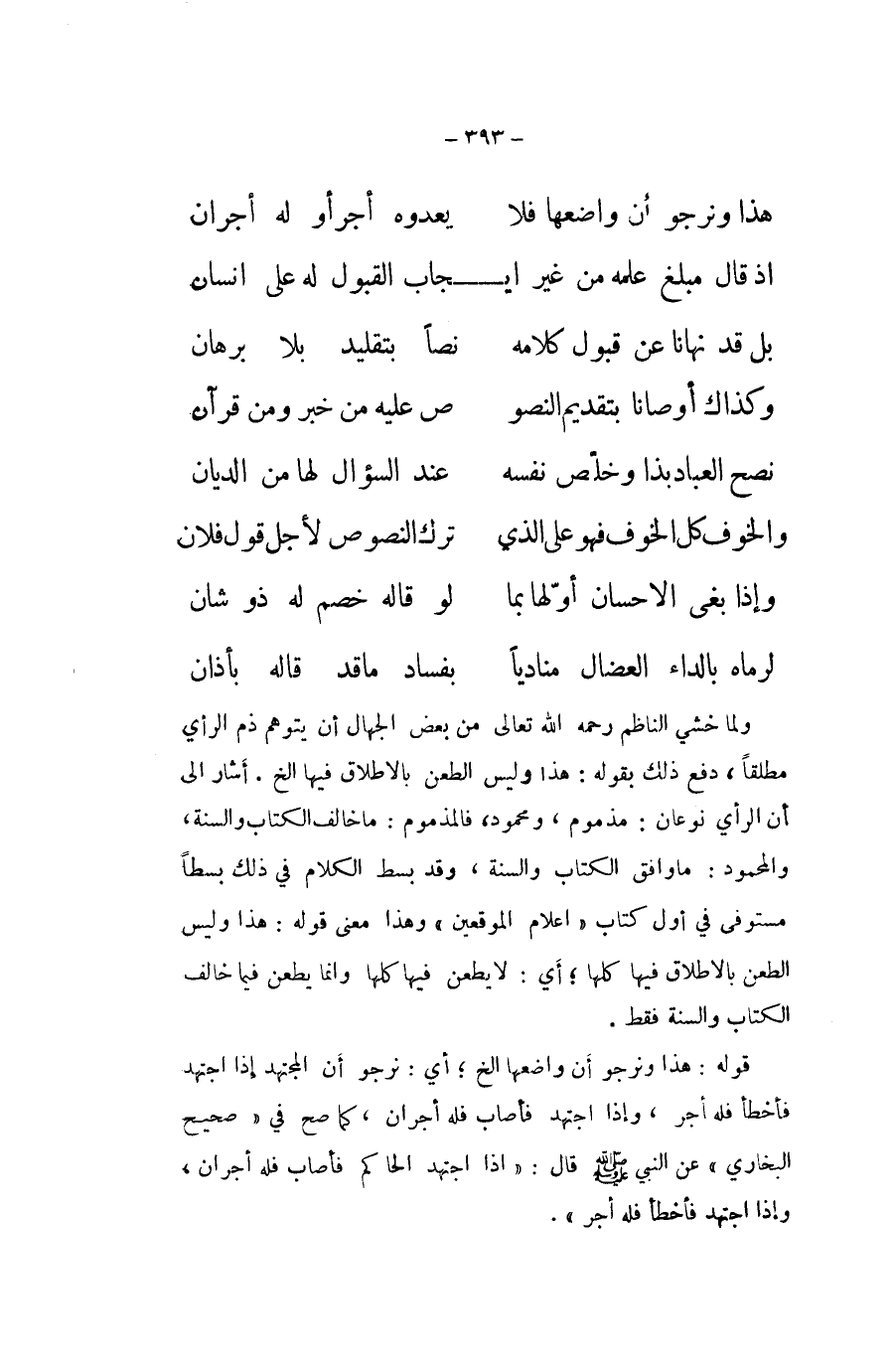 اذ قَالَ مبلغ علمه من غير ايجاب الْقبُول لَهُ على انسان ... بل قد نَهَانَا عَن قبُول كَلَامه ... نصا بتقليد بِلَا برهَان ... وكذاك أوصانا بِتَقْدِيم النصو ... ص عَلَيْهِ من خبر وَمن قُرْآن